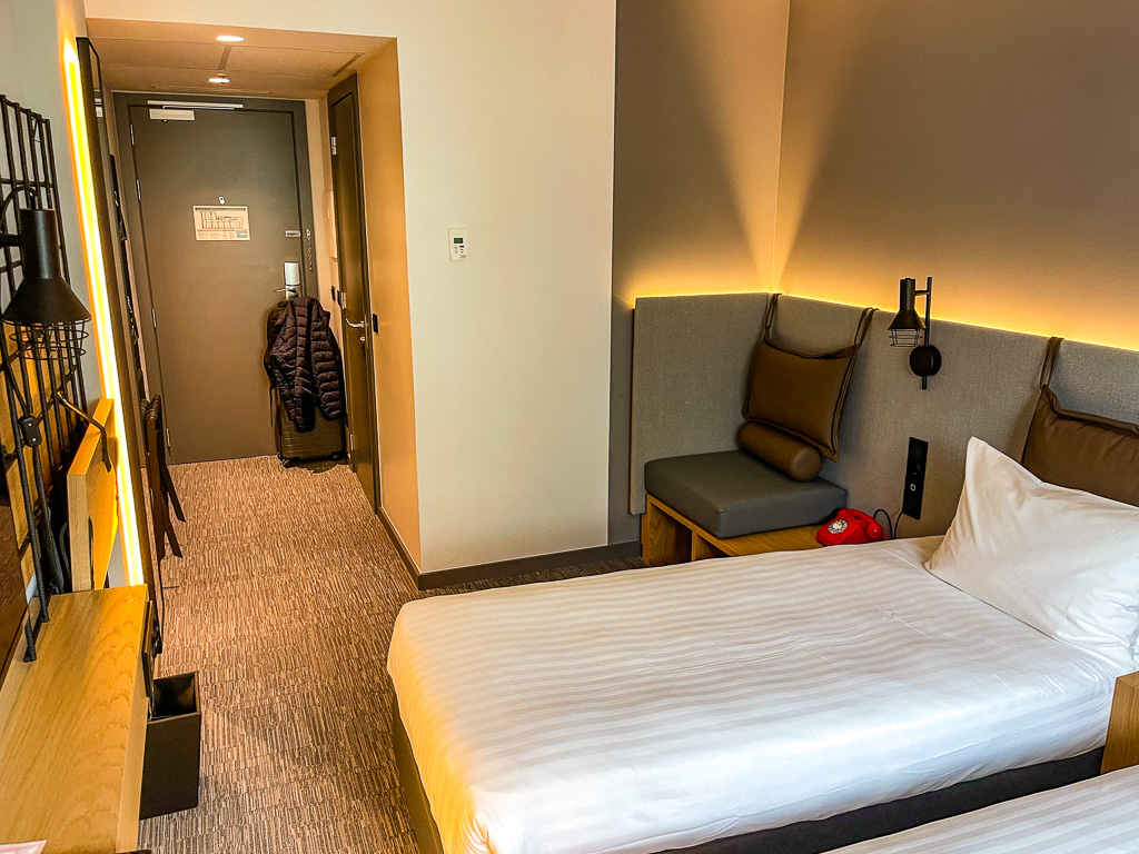 Voyageant avec un ami, nous avons opté pour une chambre à deux lits simples. La chambre est propre, plutôt lumineuse et sa taille est conforme au standard européen (= petite).