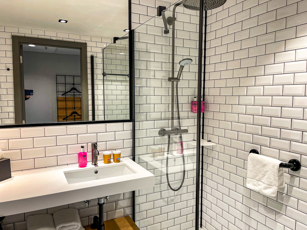 La salle de bains est fonctionnelle avec une grande douche. Bon point pour les bouteilles qui se re-remplissent plutôt que des flacons individuels jetables.