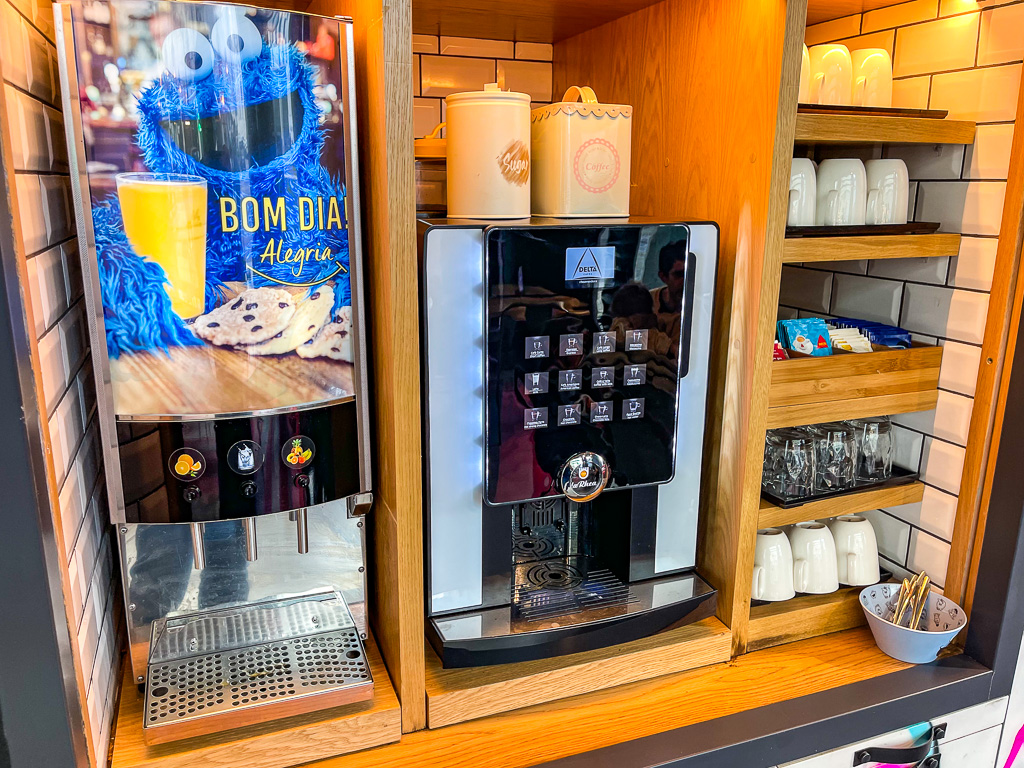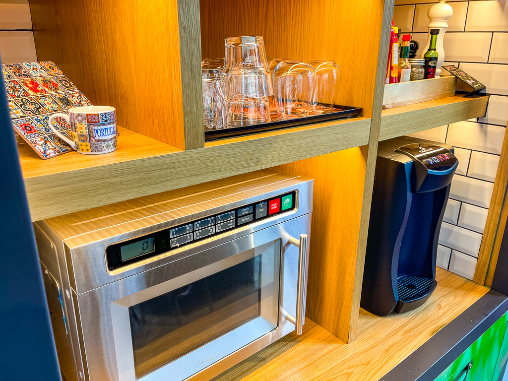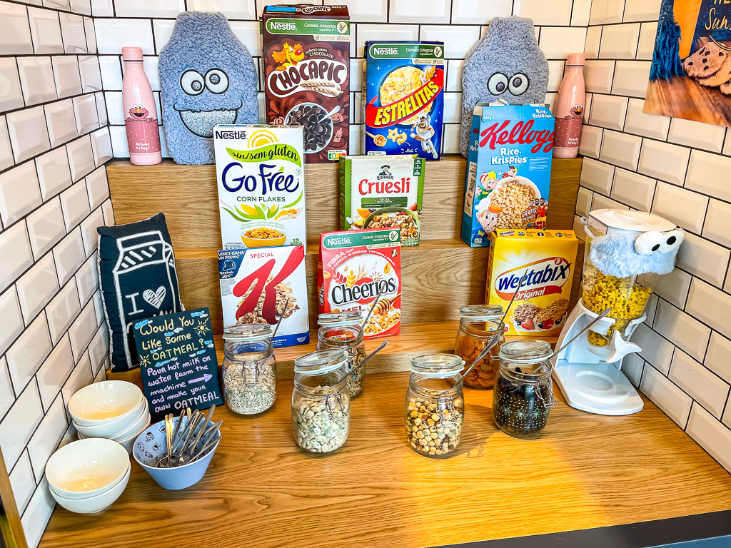 On y retrouve les classiques d’un petit-déjeuner : oeufs brouillés, jambon, différents types de pains, croissants, Pasteis de Natas, fruits, yaourts, céréales. Notez également la présence d’un micro-ondes (apprécié pour des familles).