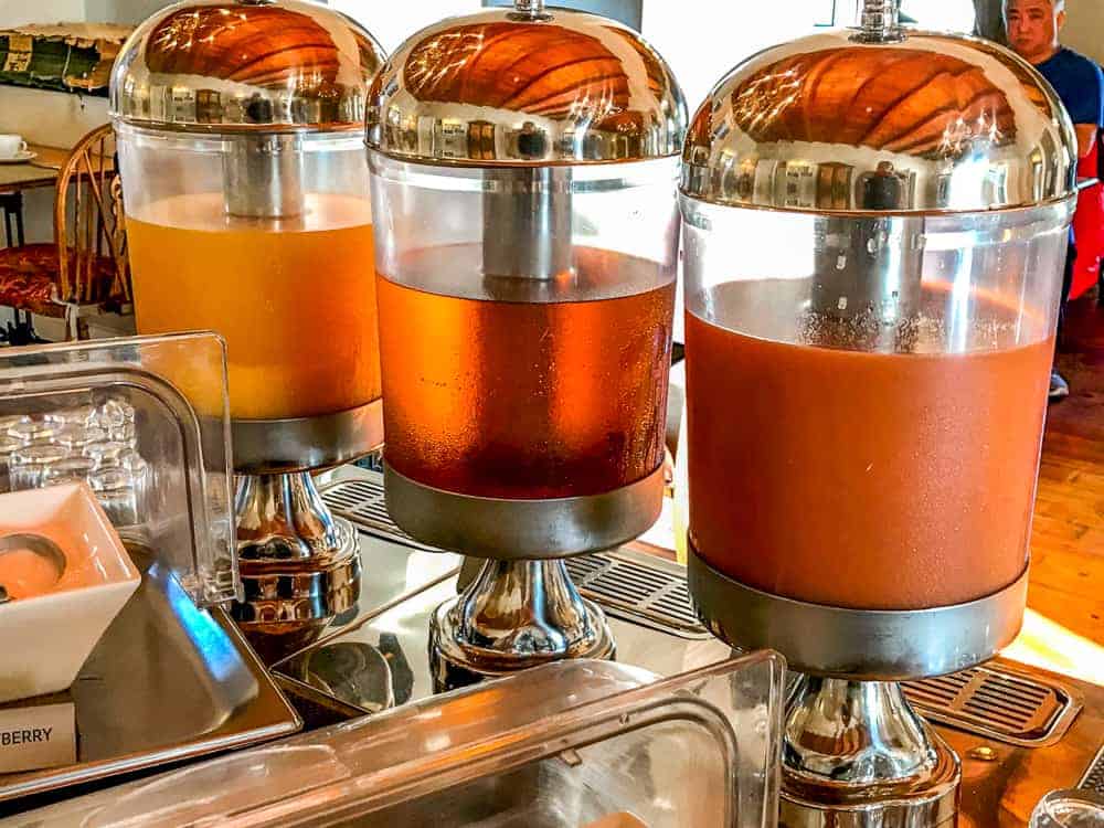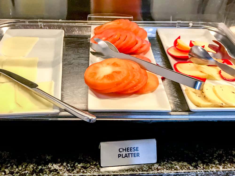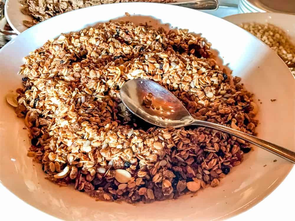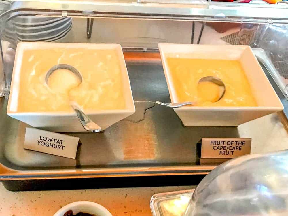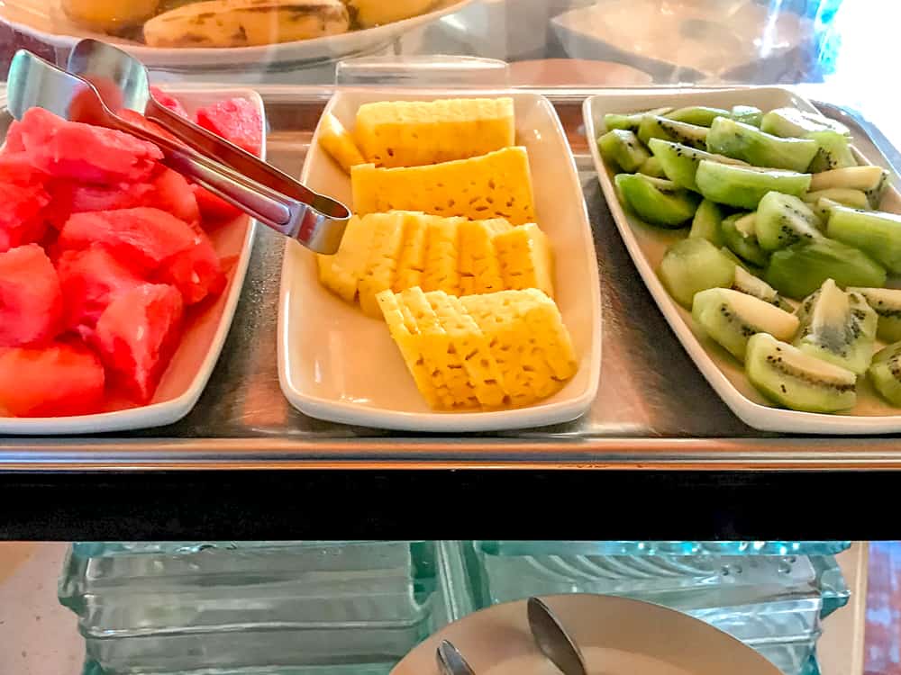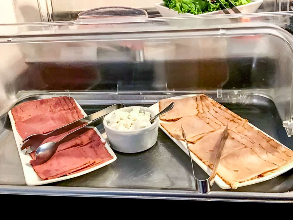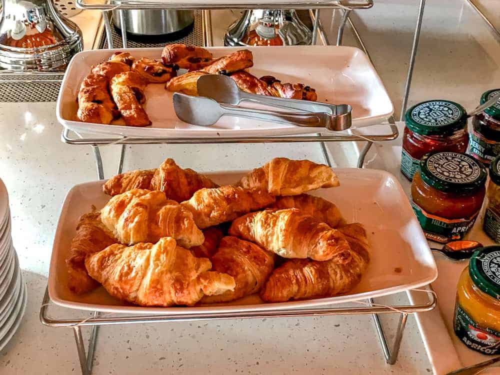 Le déjeuner est composé d’un buffet froid avec jus, fruits, yogourt, céréales, muffins, viennoiseries et d’un petit buffet chaud avec des charcuteries, fromages, plat de poisson, saucisses, bacon, fèves au lard et différents pains.