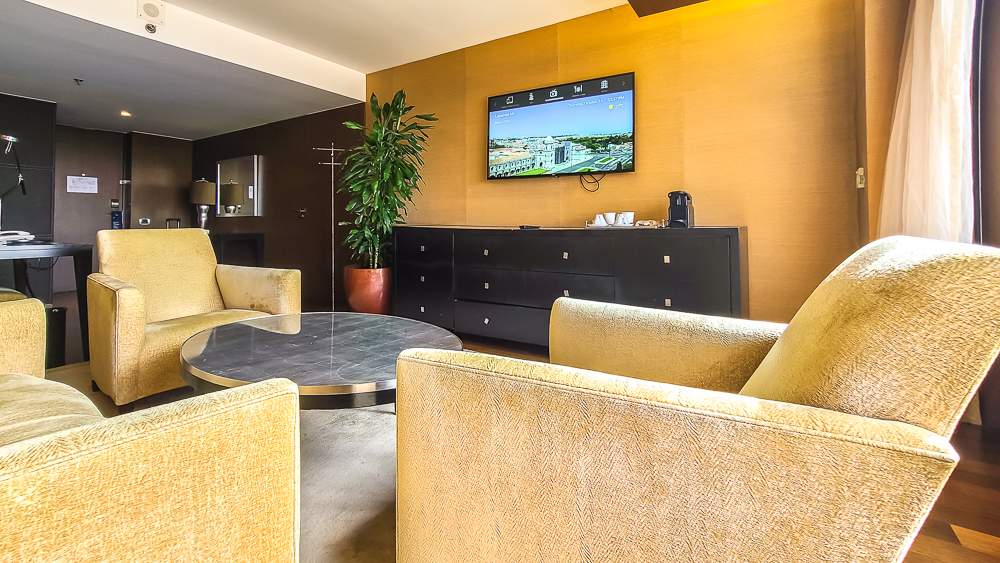 La suite 2502 (club level) est très spacieuse. Dès l’entrée dans la suite, on s’aperçoit que les couleurs primaires de l’hôtel y sont présentes : murs bruns et orangés, plancher de bois ainsi que certains murs avec une imitation de cuir – ce même cuir qu’on retrouve sur les portes.