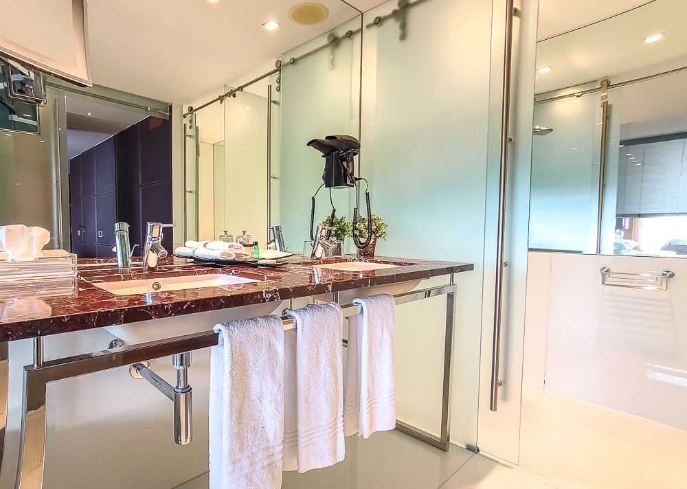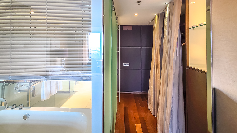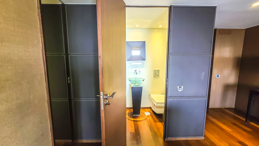 Dans le passage, entre la salle de bain et la chambre, il y a les espaces de rangement, un coffre-fort et un mini réfrigérateur. Il y a aussi, une porte coulissante pour séparer la chambre – et la salle de bain – du reste de la suite.
