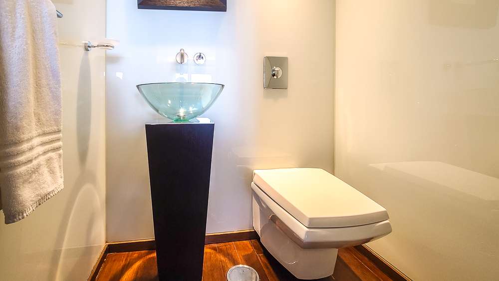 On remarque également qu’une grande fenêtre sépare la chambre de la salle de bain avec un « store » électrique permettant d’avoir une intimité. On retrouve, bien sûr, tous les produits essentiels pour son hygiène personnelle.