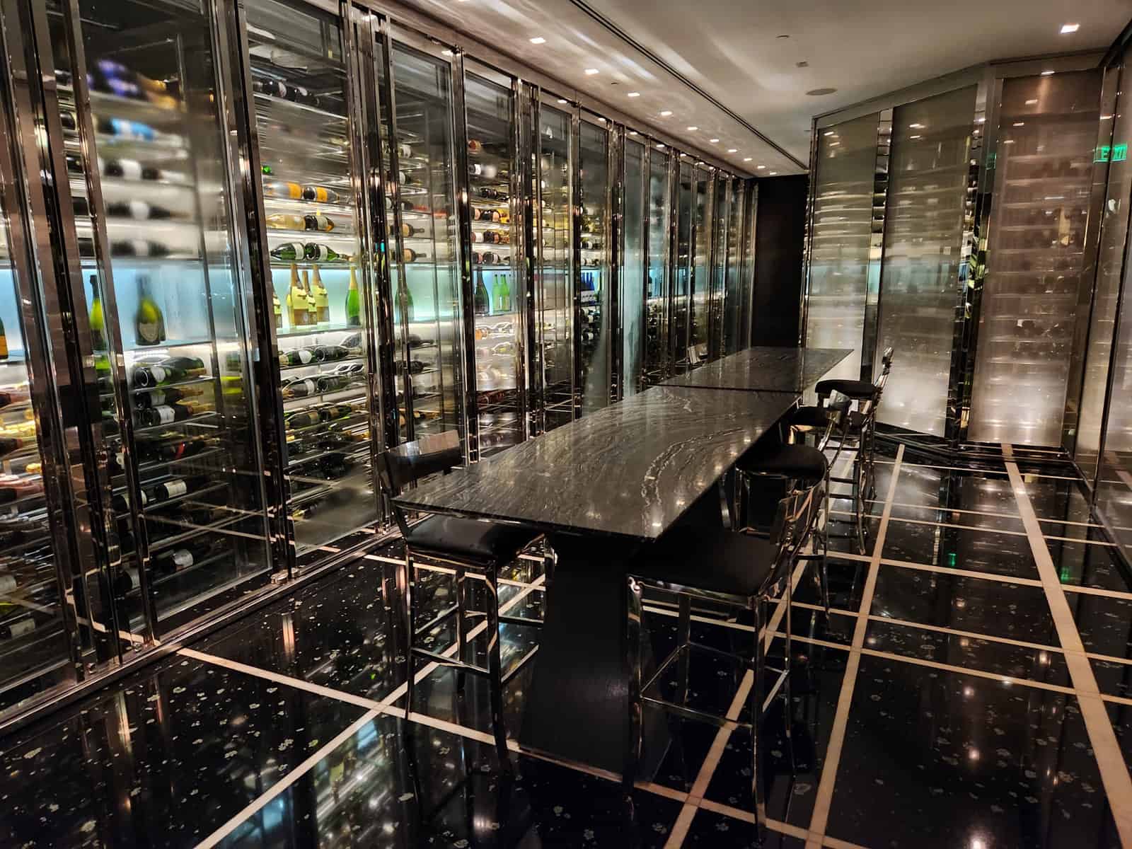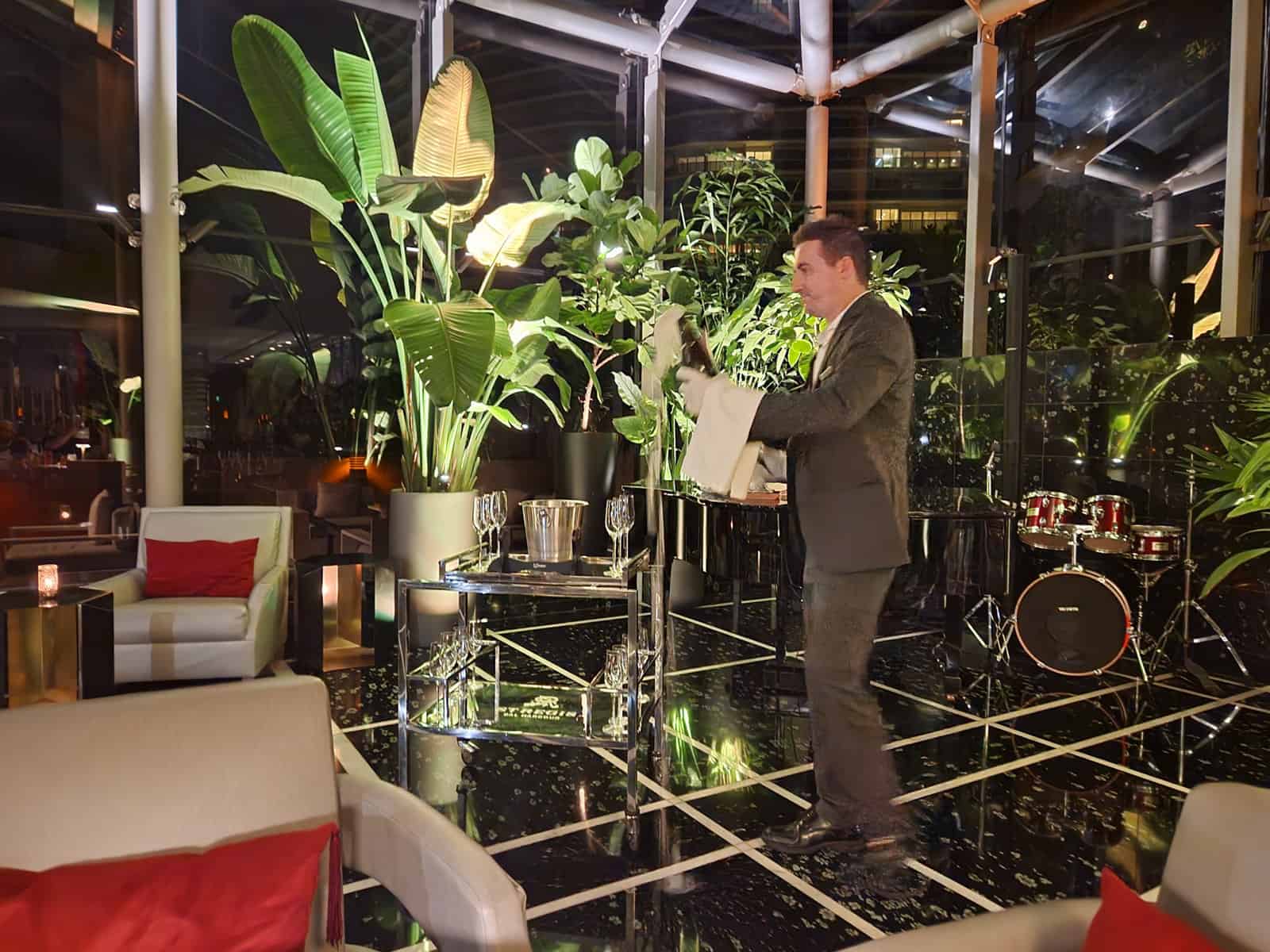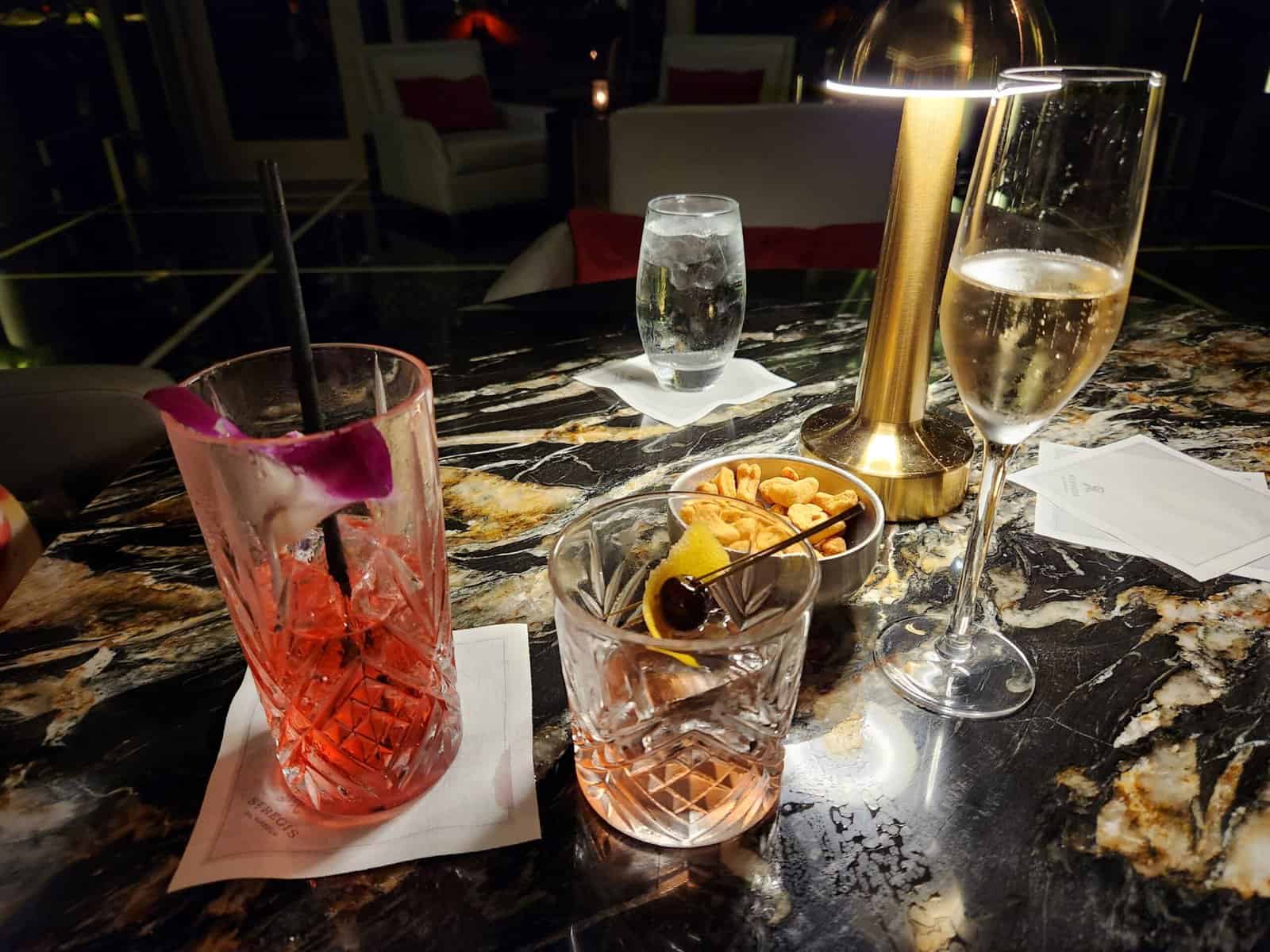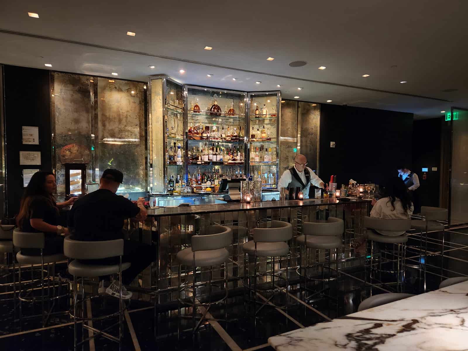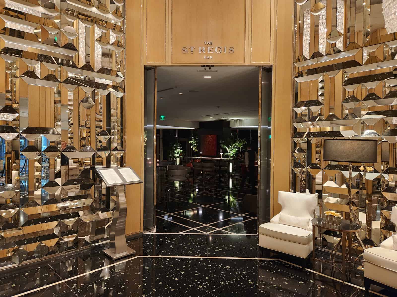 Le dernier, mais certainement pas le moindre, était le bar du St. Regis. Il s’agit d’un espace superbe qui reprend le thème du hall d’entrée principal avec un look moderne et des surfaces en miroir. Des champagnes, une vaste carte des vins et de délicieux cocktails artisanaux étaient disponibles. Nous y sommes allés deux fois au coucher du soleil, lorsque l’un des majordomes a procédé au rituel quotidien de sabrage du champagne.