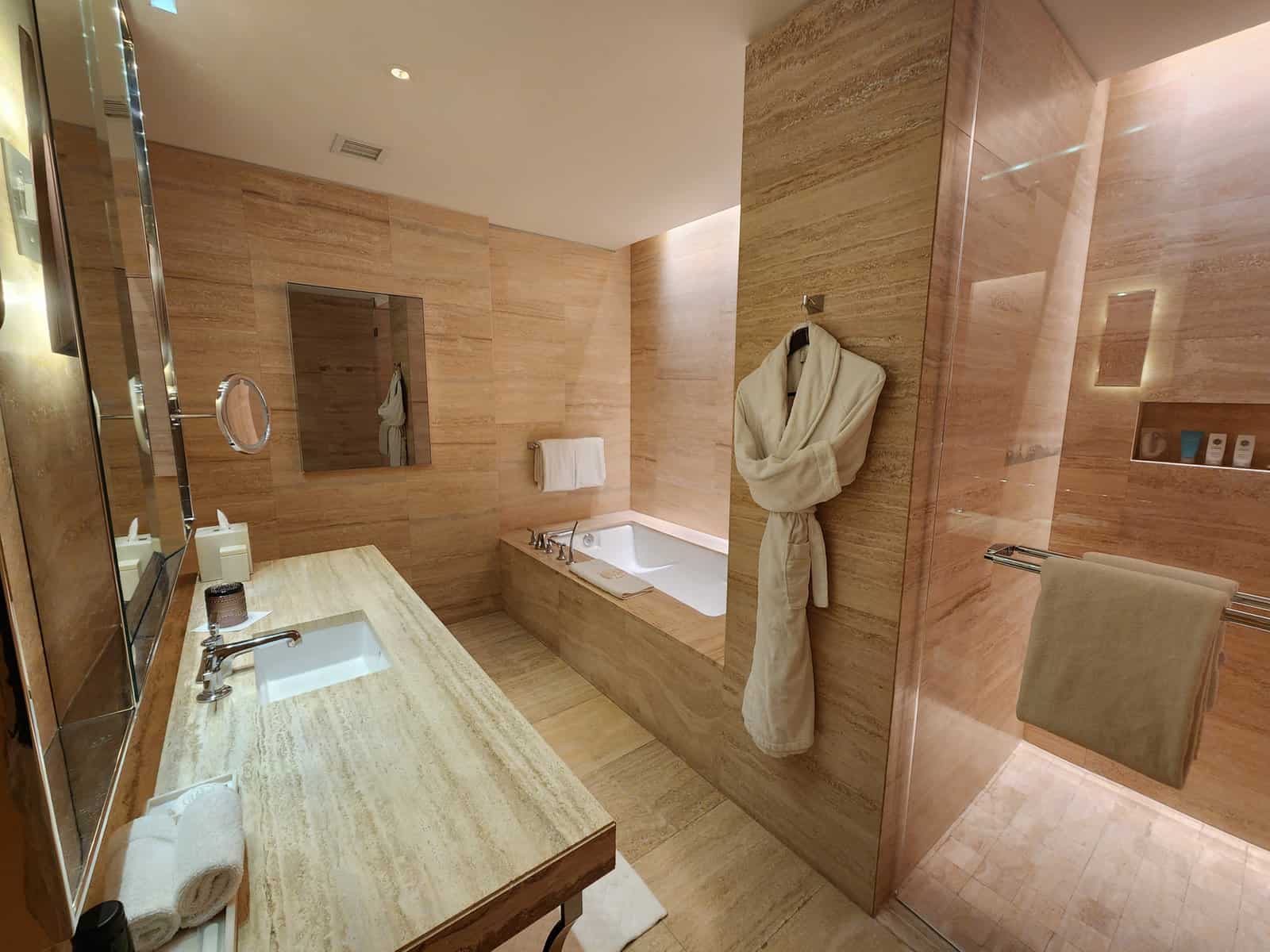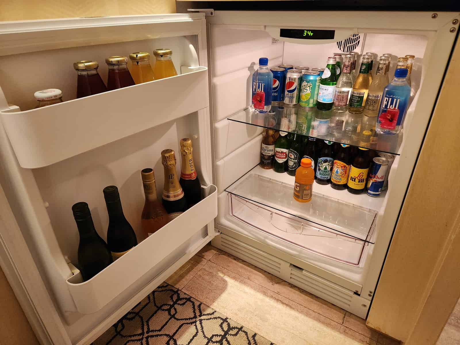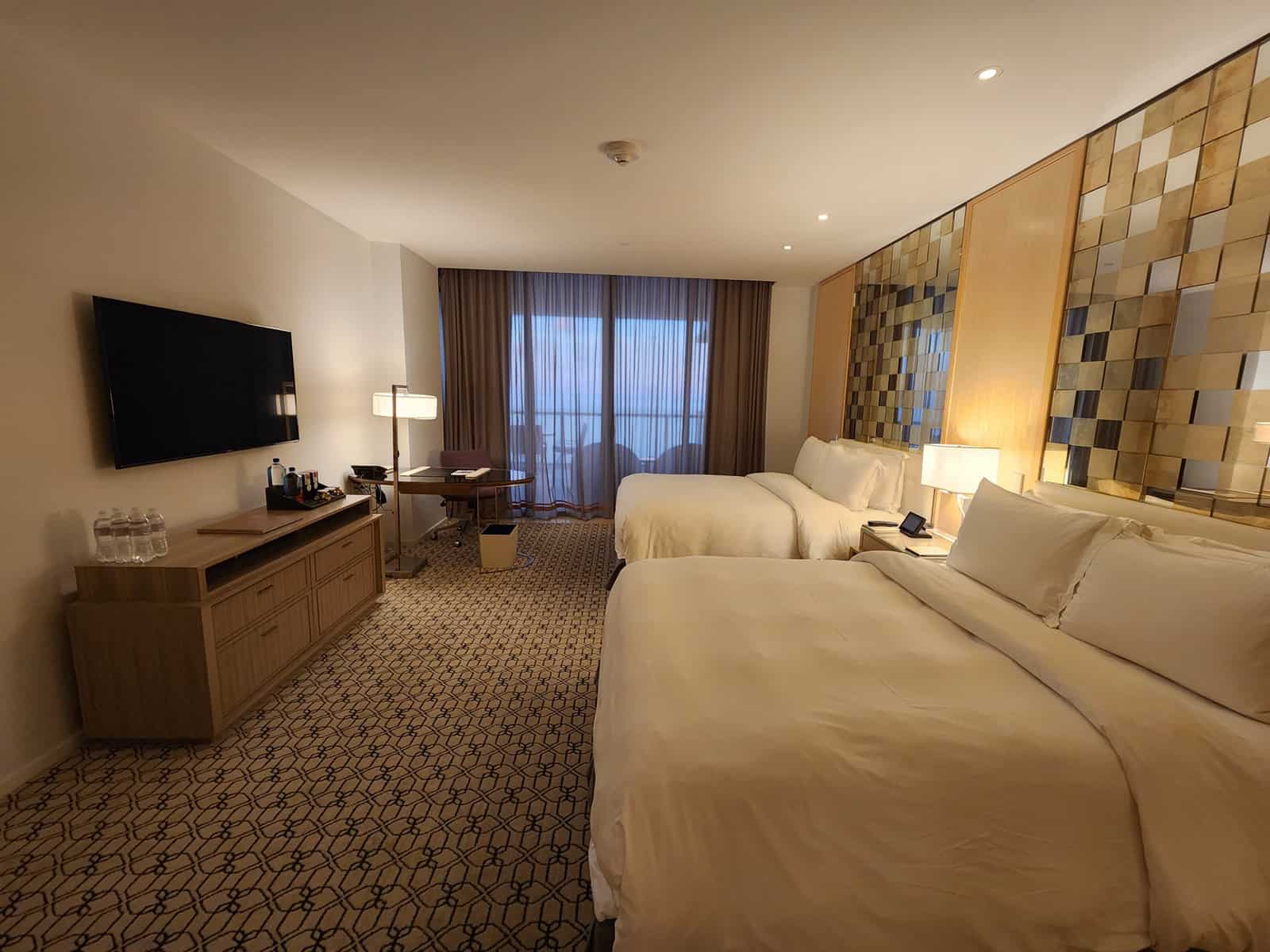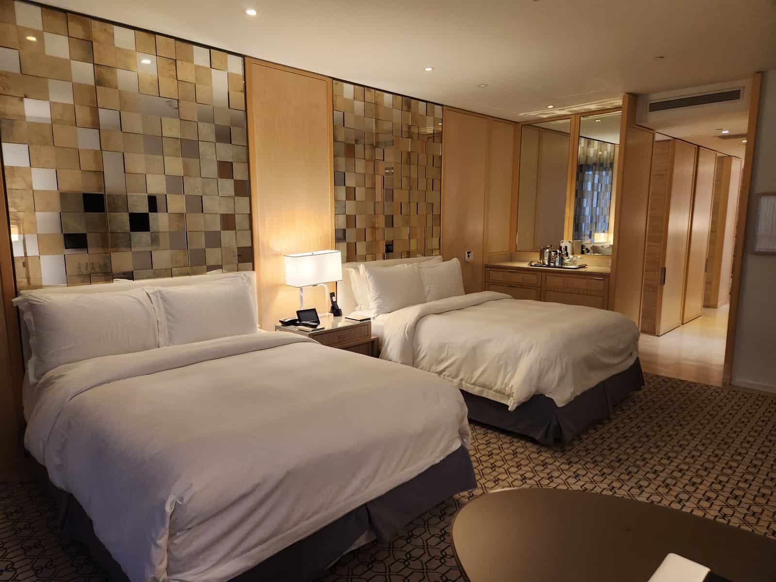 La chambre, en un mot, était sublime. Outre sa grande taille, l’ensemble de l’espace était agrémenté de couleurs crème claires et de touches élégantes. À l’entrée, il y a un foyer et un placard, suivis d’un couloir avec des sections de la salle de bains de chaque côté, puis de la chambre principale qui, pour nous, contenait deux grands lits. Un grand minibar avec un réfrigérateur bien rempli était disponible, ainsi qu’un bureau et des commandes numériques pour la chambre.