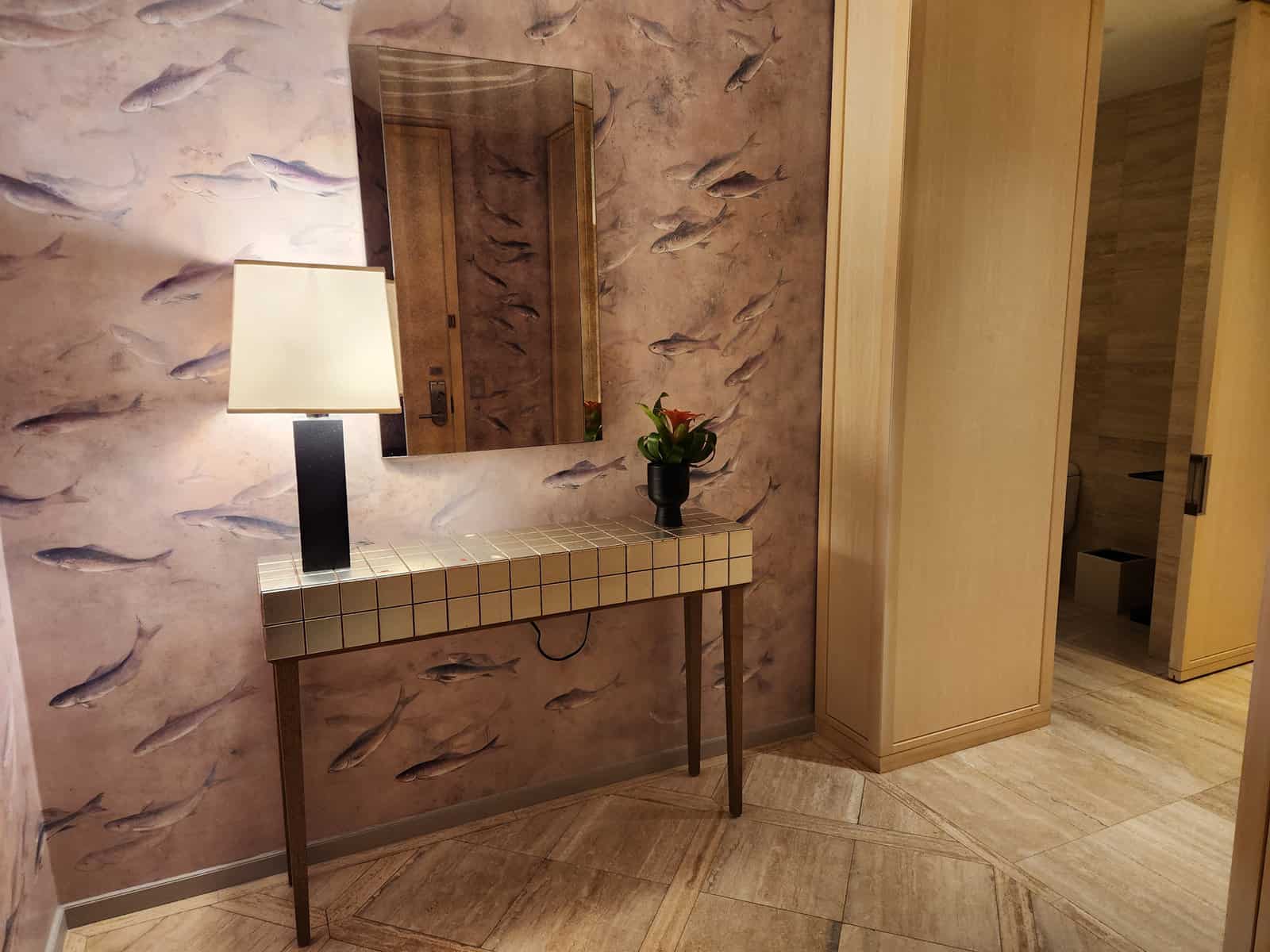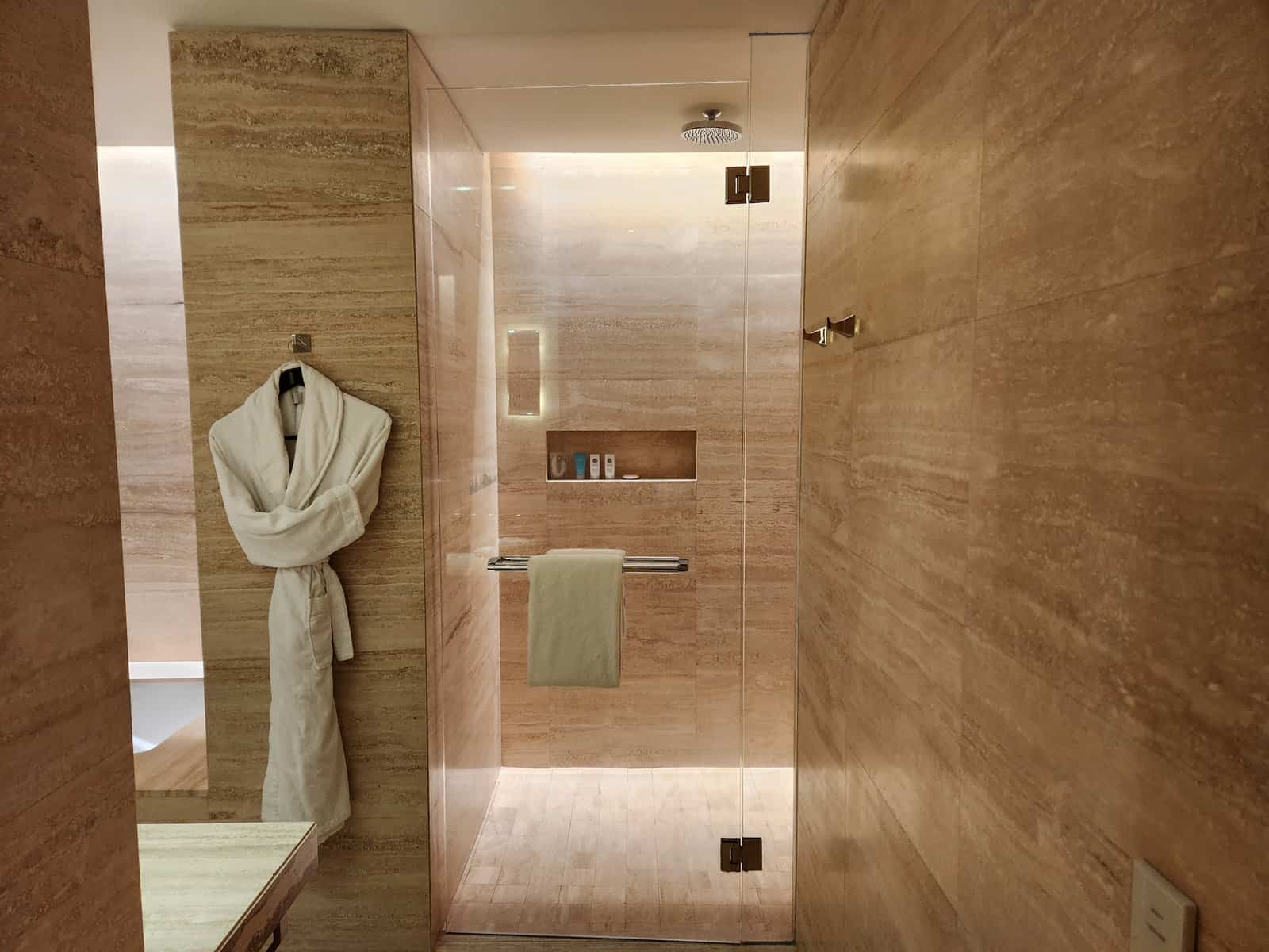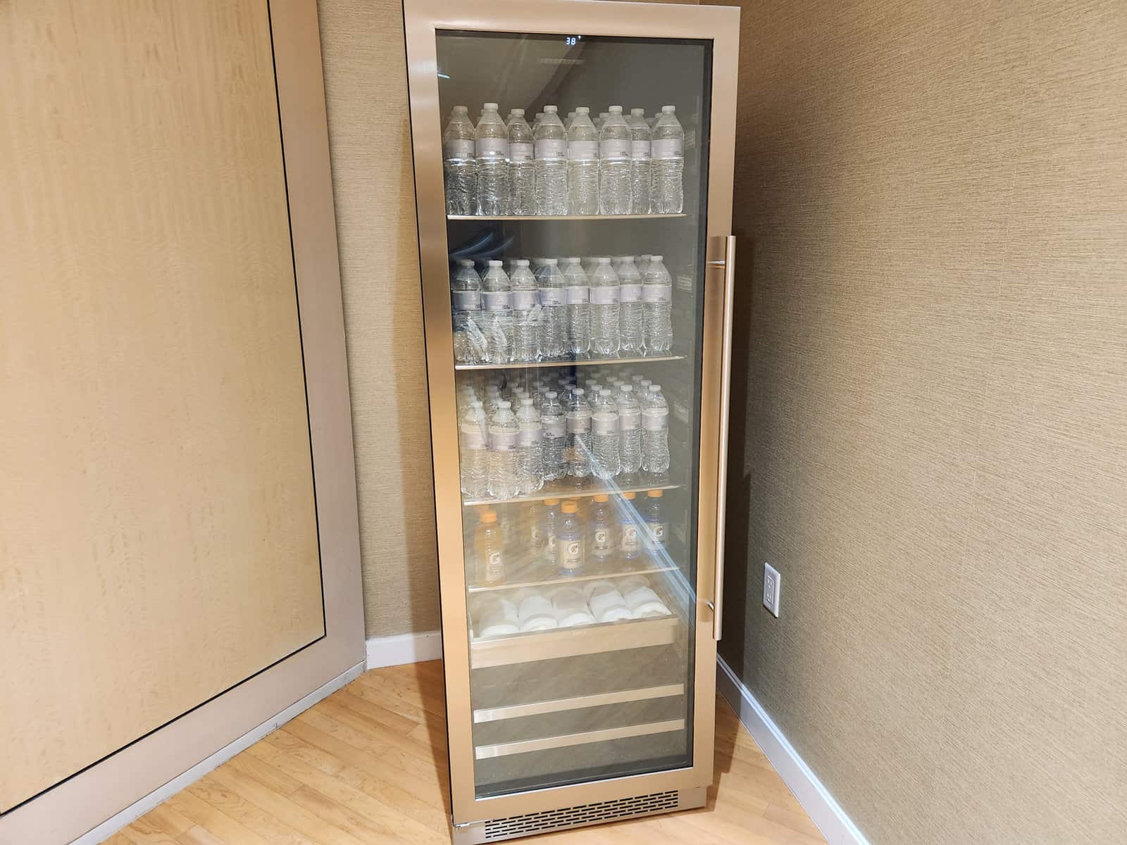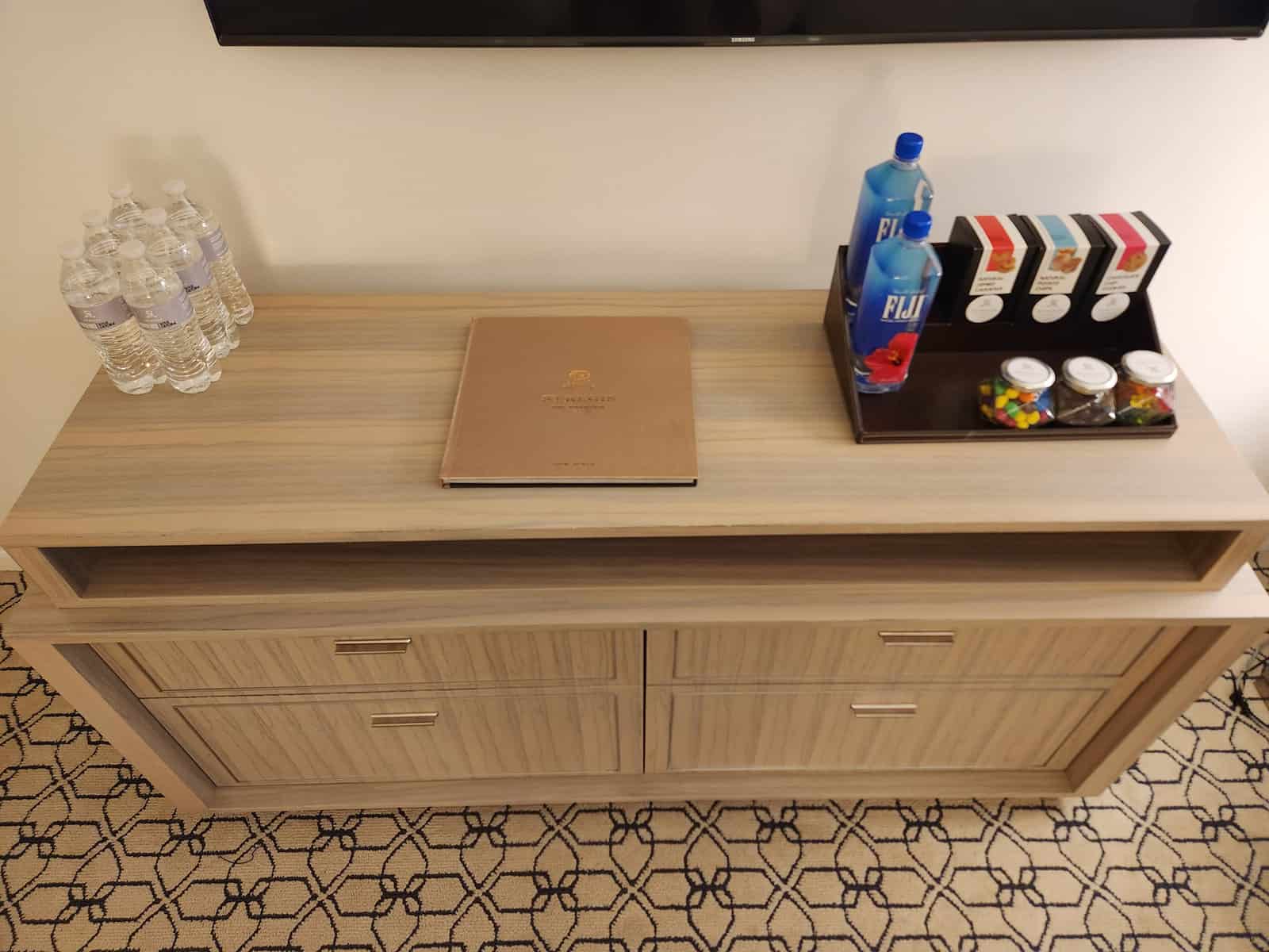 La chambre, en un mot, était sublime. Outre sa grande taille, l’ensemble de l’espace était agrémenté de couleurs crème claires et de touches élégantes. À l’entrée, il y a un foyer et un placard, suivis d’un couloir avec des sections de la salle de bains de chaque côté, puis de la chambre principale qui, pour nous, contenait deux grands lits. Un grand minibar avec un réfrigérateur bien rempli était disponible, ainsi qu’un bureau et des commandes numériques pour la chambre.