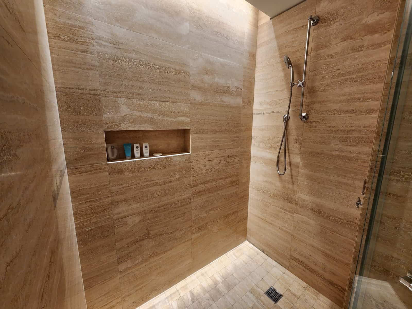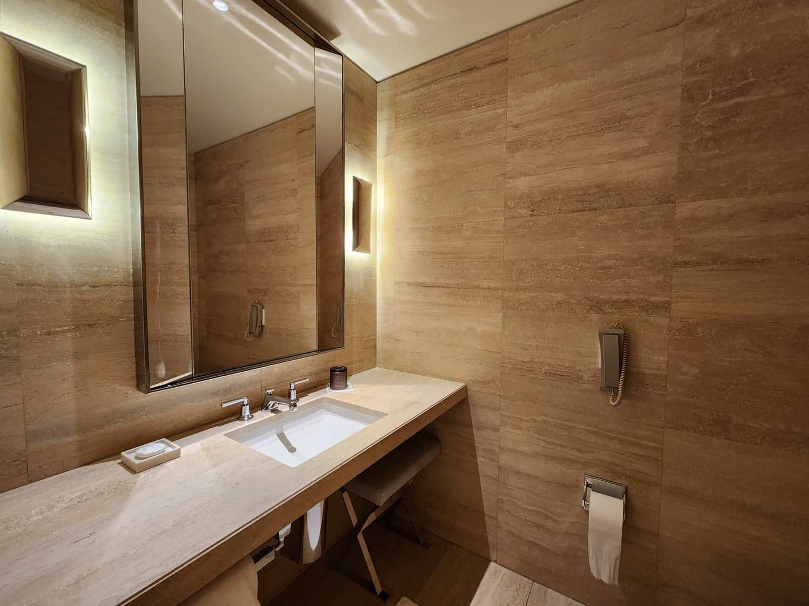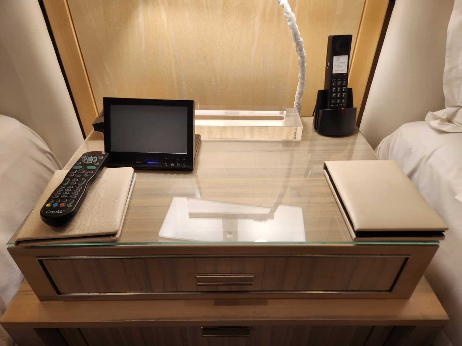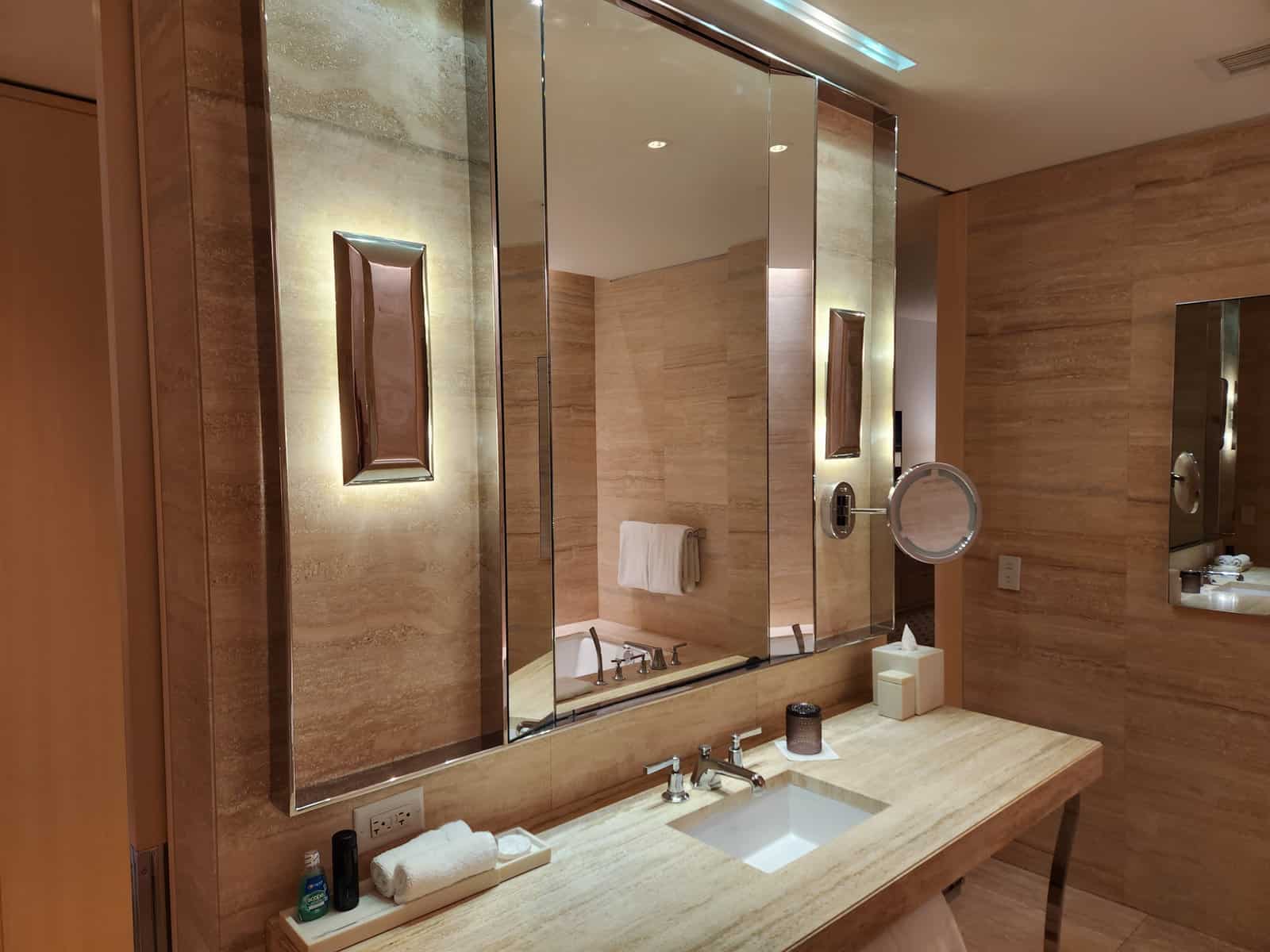 La chambre, en un mot, était sublime. Outre sa grande taille, l’ensemble de l’espace était agrémenté de couleurs crème claires et de touches élégantes. À l’entrée, il y a un foyer et un placard, suivis d’un couloir avec des sections de la salle de bains de chaque côté, puis de la chambre principale qui, pour nous, contenait deux grands lits. Un grand minibar avec un réfrigérateur bien rempli était disponible, ainsi qu’un bureau et des commandes numériques pour la chambre.