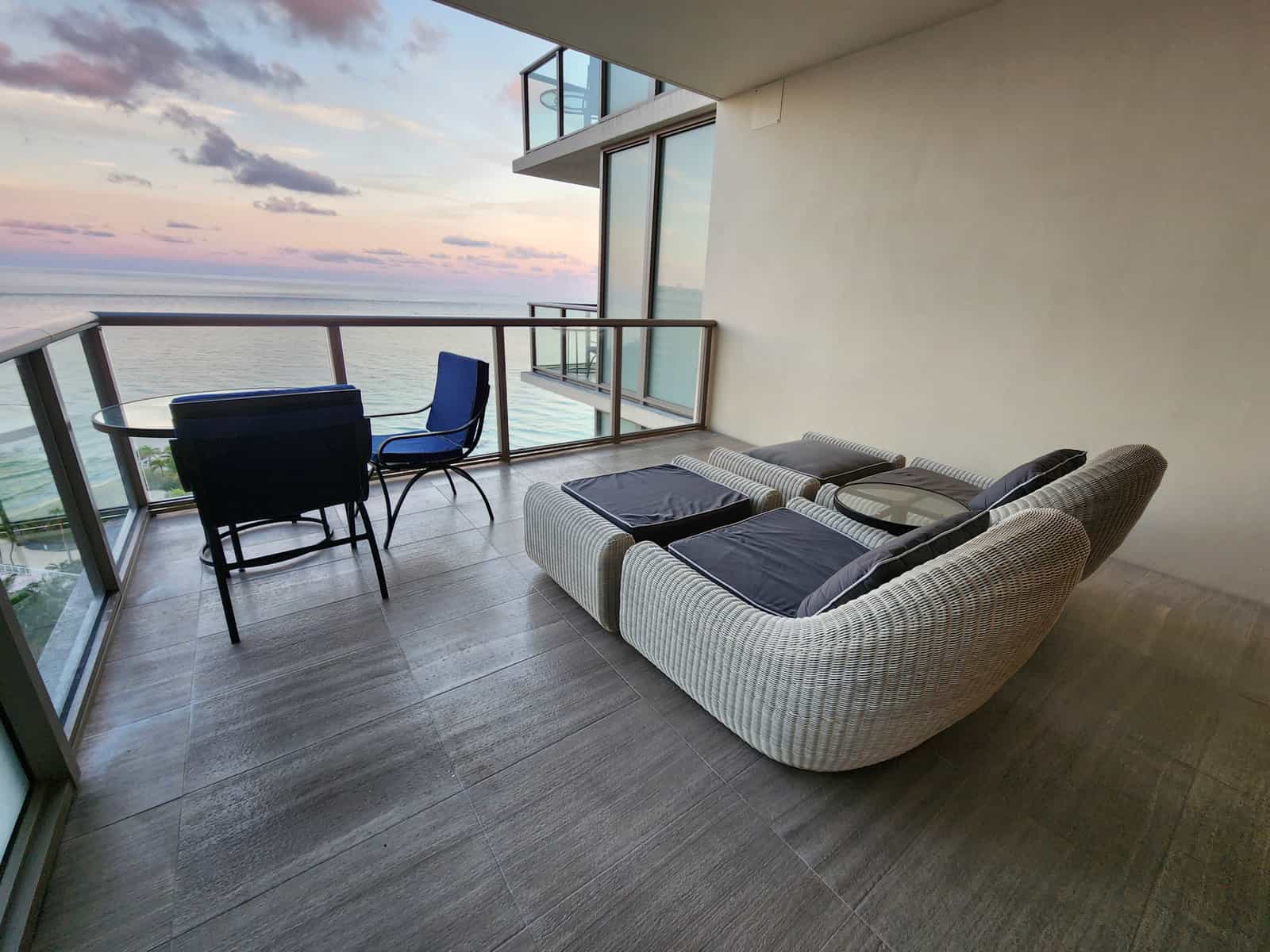 Le grand balcon est équipé de chaises longues très confortables, d’une petite table et de chaises, et offre une vue imprenable sur l’océan Atlantique.