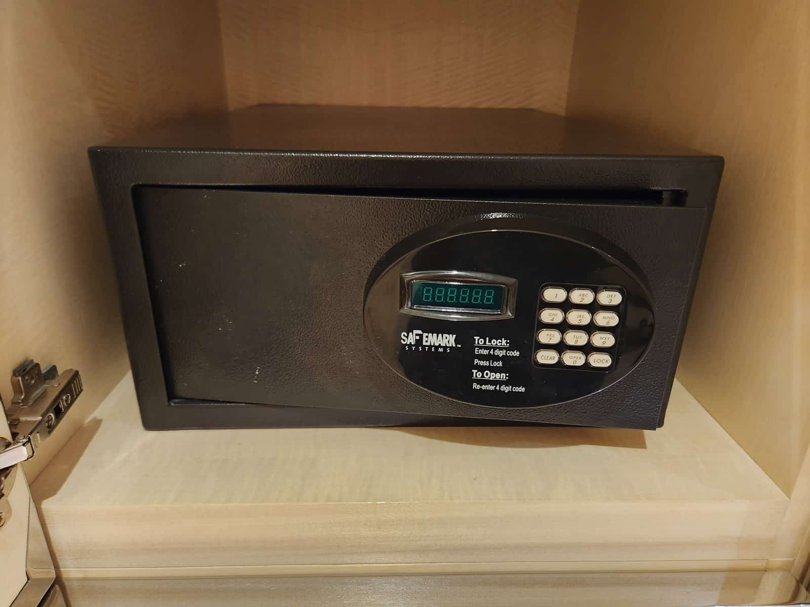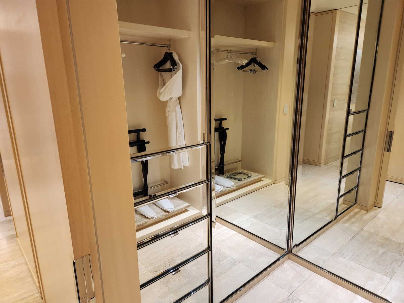 La grande armoire est entièrement recouverte de miroirs et contient un peignoir et un coffre-fort pour les objets de valeur.