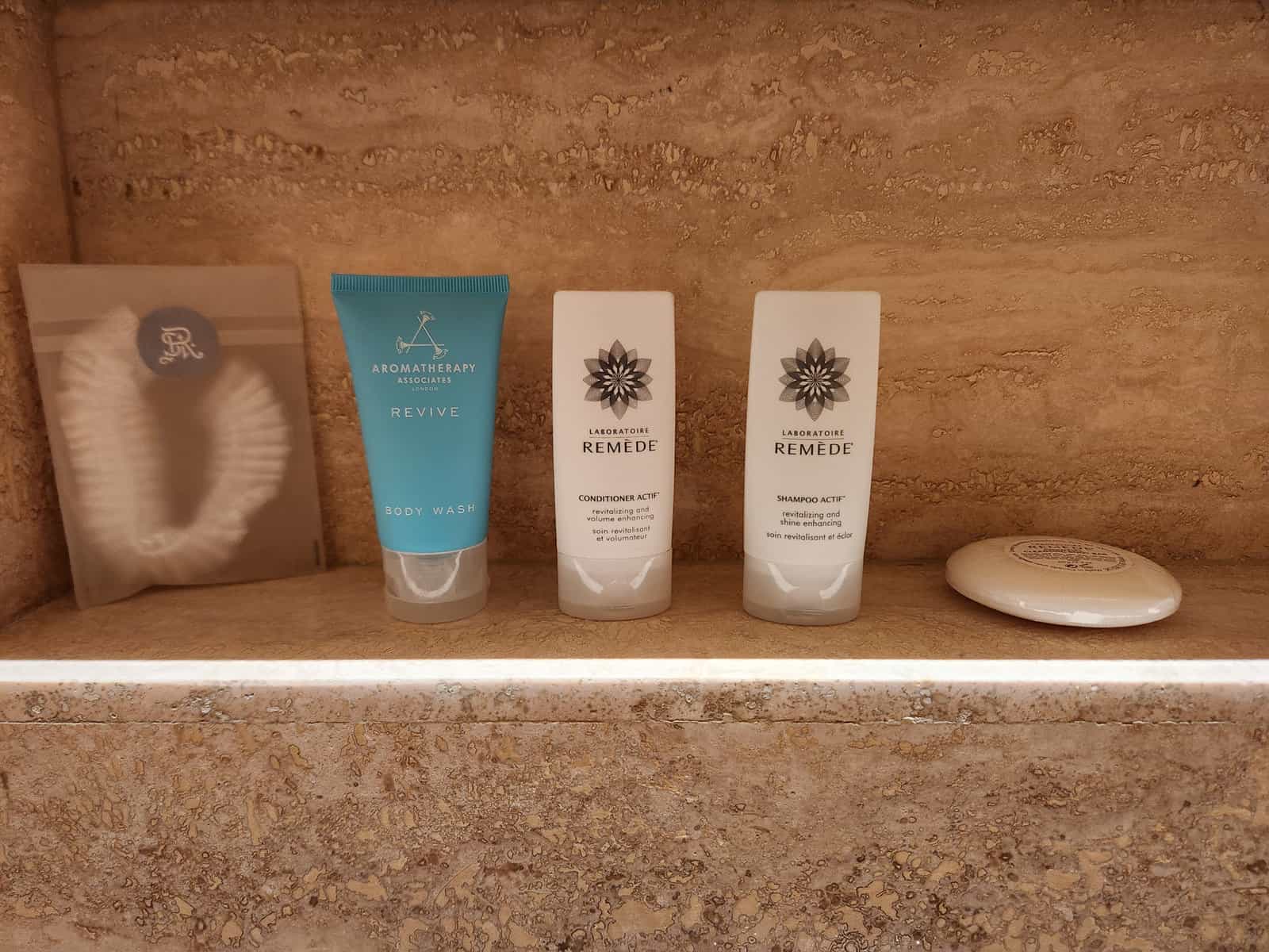La salle de bain en marbre était divisée de chaque côté du couloir et comportait une immense baignoire, une douche, deux lavabos, des articles de toilette du Laboratoire Remede et d’Aromatherapy Associates.