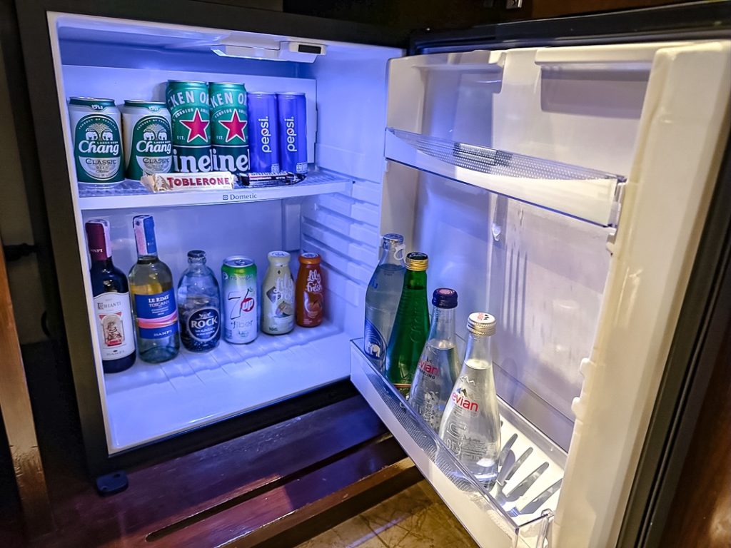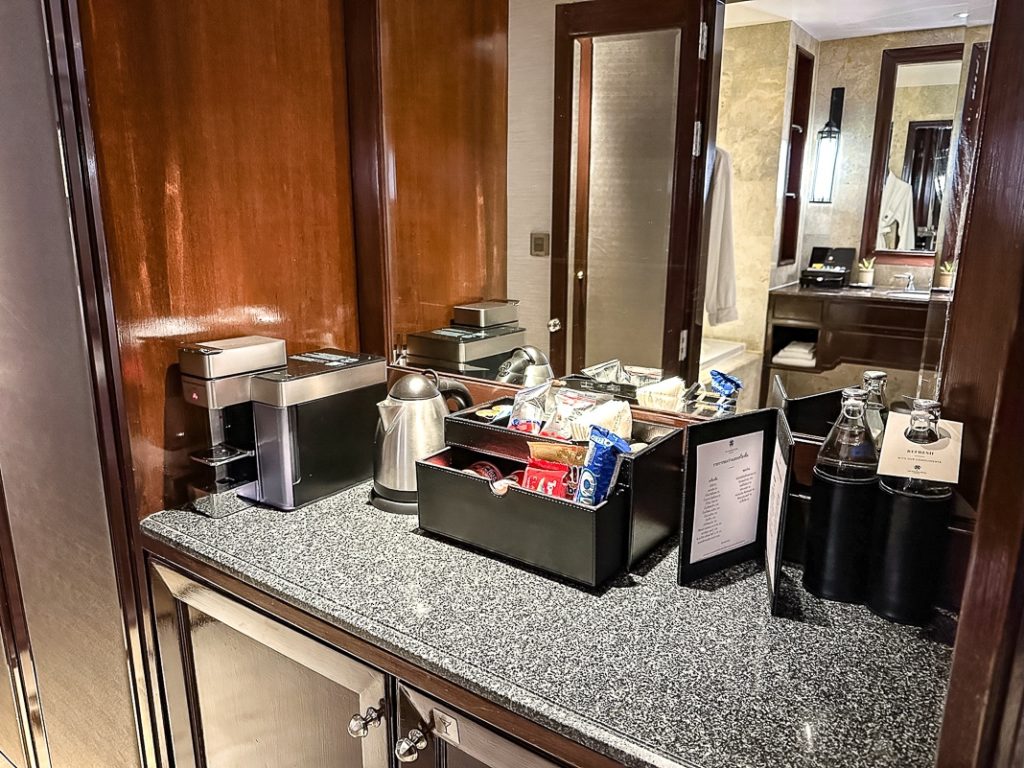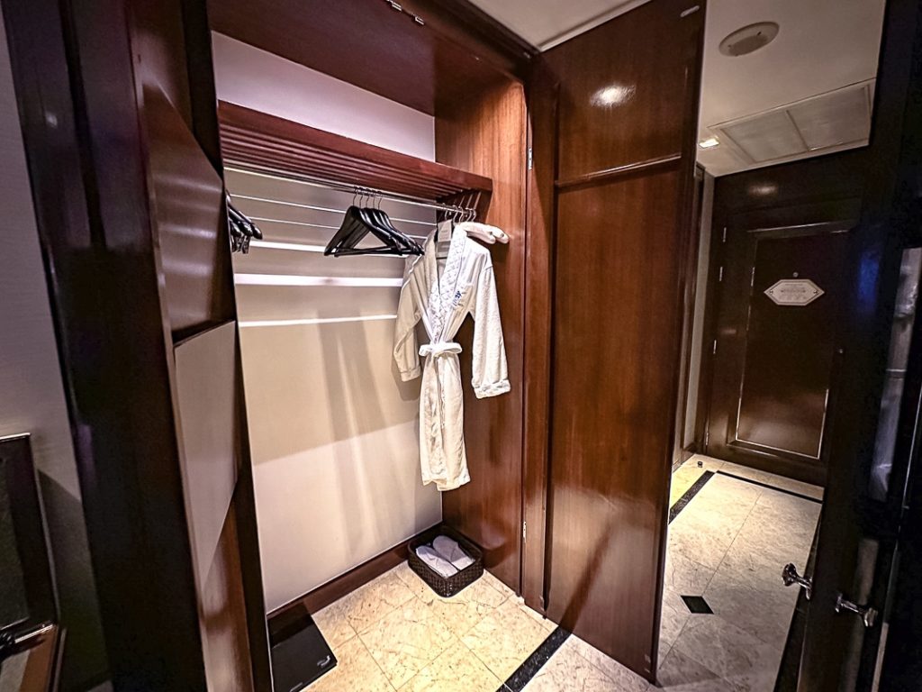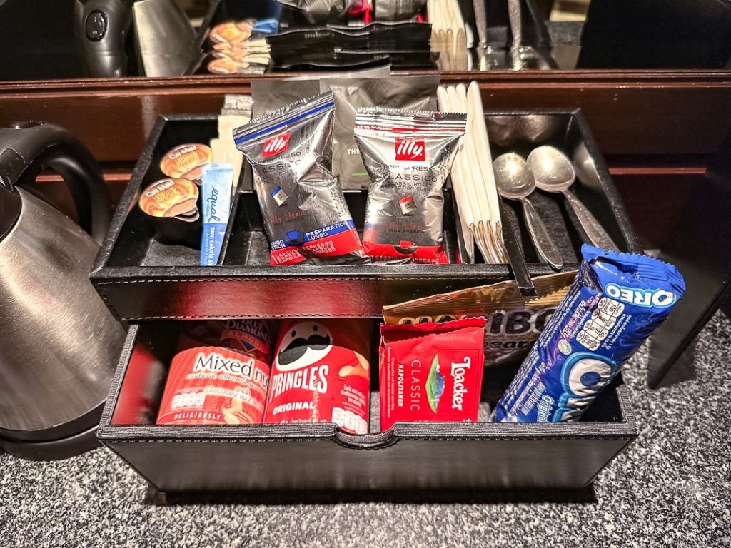 La chambre disposait de toutes les commodités habituelles auxquelles on peut s’attendre, comme un mini-bar avec des boissons et de l’alcool, des snacks, du café et des thés (marque Illy), et des bouteilles d’eau fraîche qui étaient réapprovisionnées quotidiennement ou sans demande. L’armoire était également assez grande pour contenir les vêtements de deux personnes, et il y avait aussi des peignoirs confortables.
