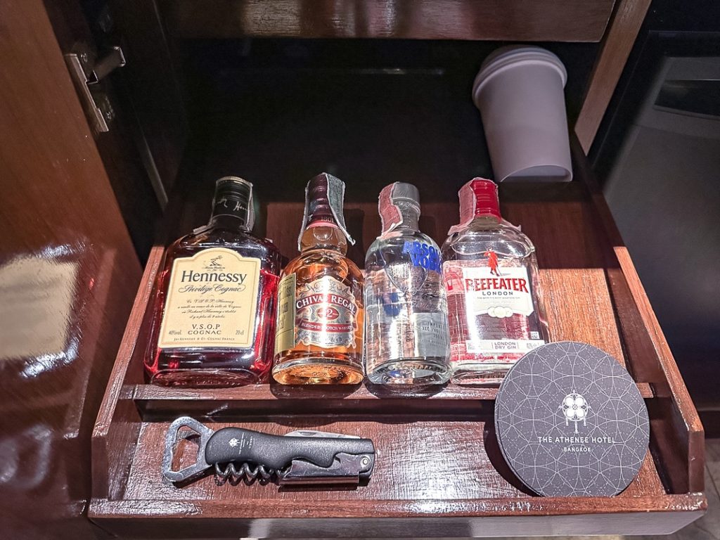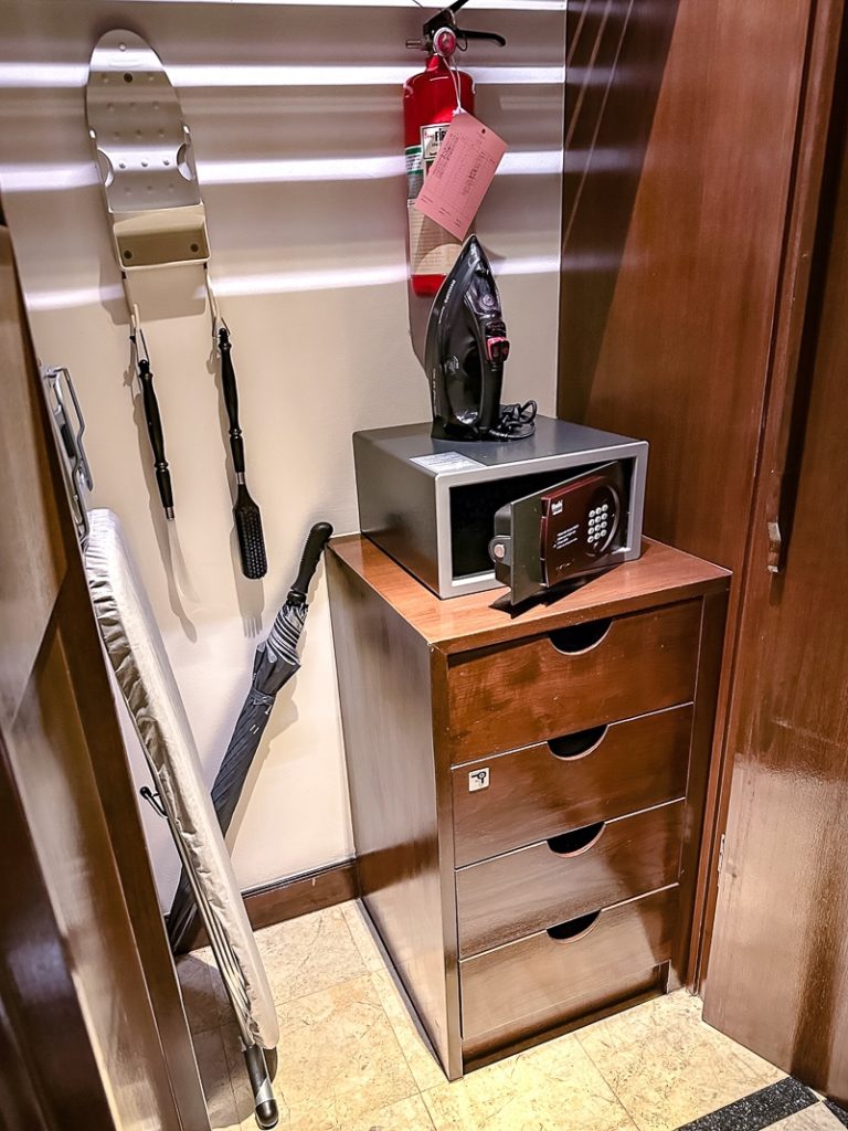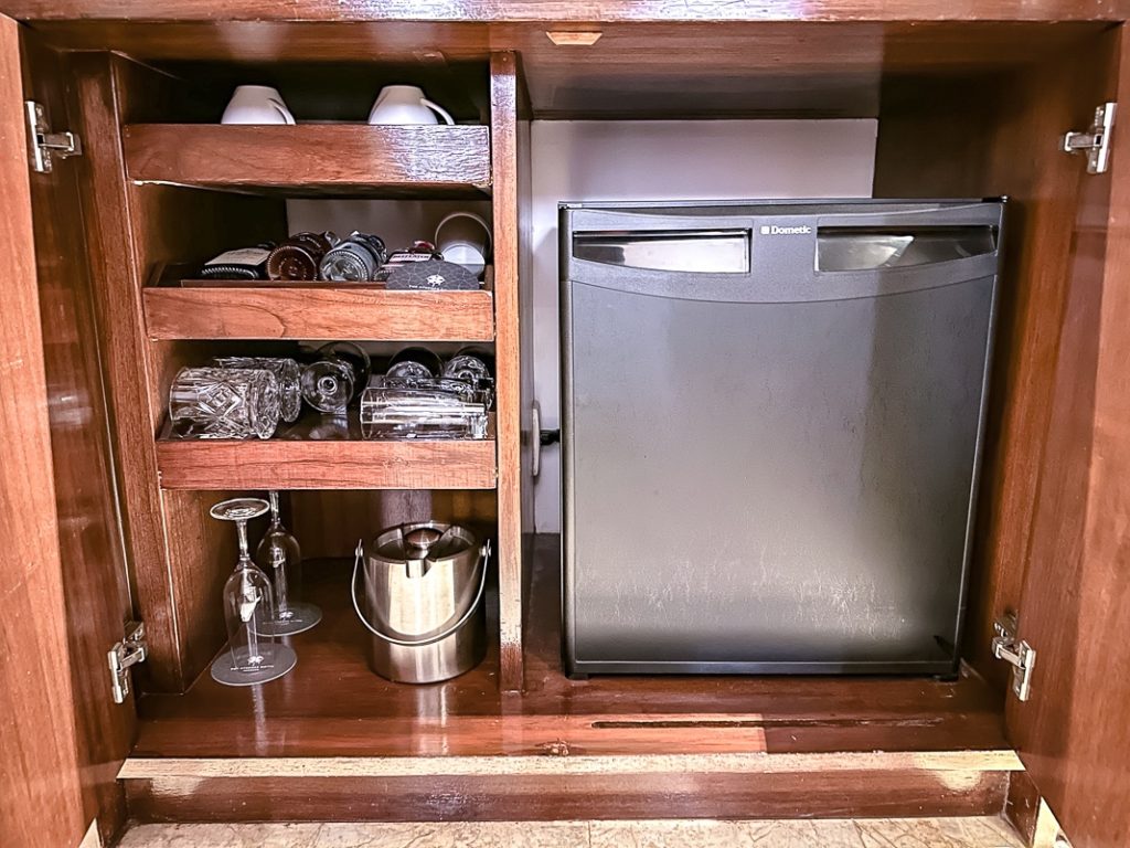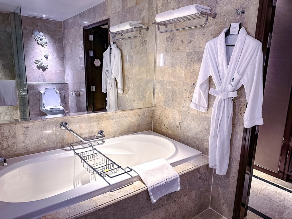La chambre disposait de toutes les commodités habituelles auxquelles on peut s’attendre, comme un mini-bar avec des boissons et de l’alcool, des snacks, du café et des thés (marque Illy), et des bouteilles d’eau fraîche qui étaient réapprovisionnées quotidiennement ou sans demande. L’armoire était également assez grande pour contenir les vêtements de deux personnes, et il y avait aussi des peignoirs confortables.