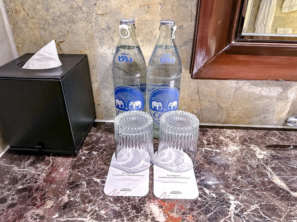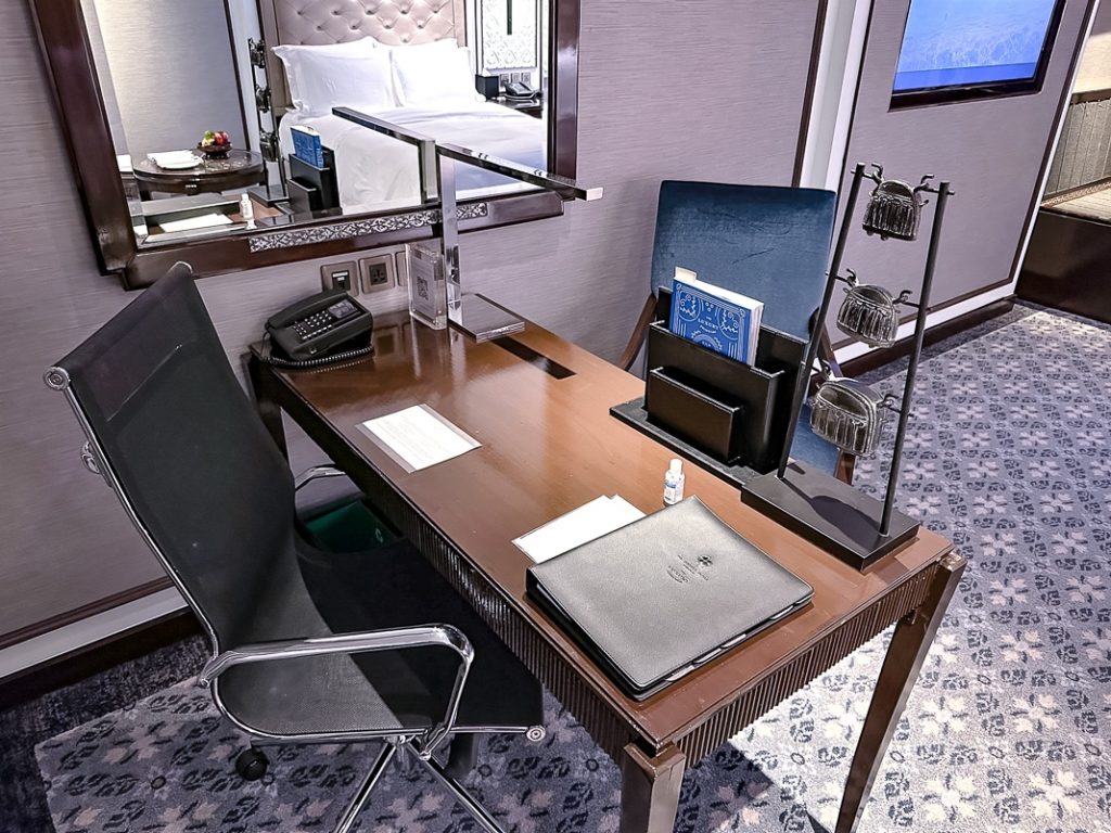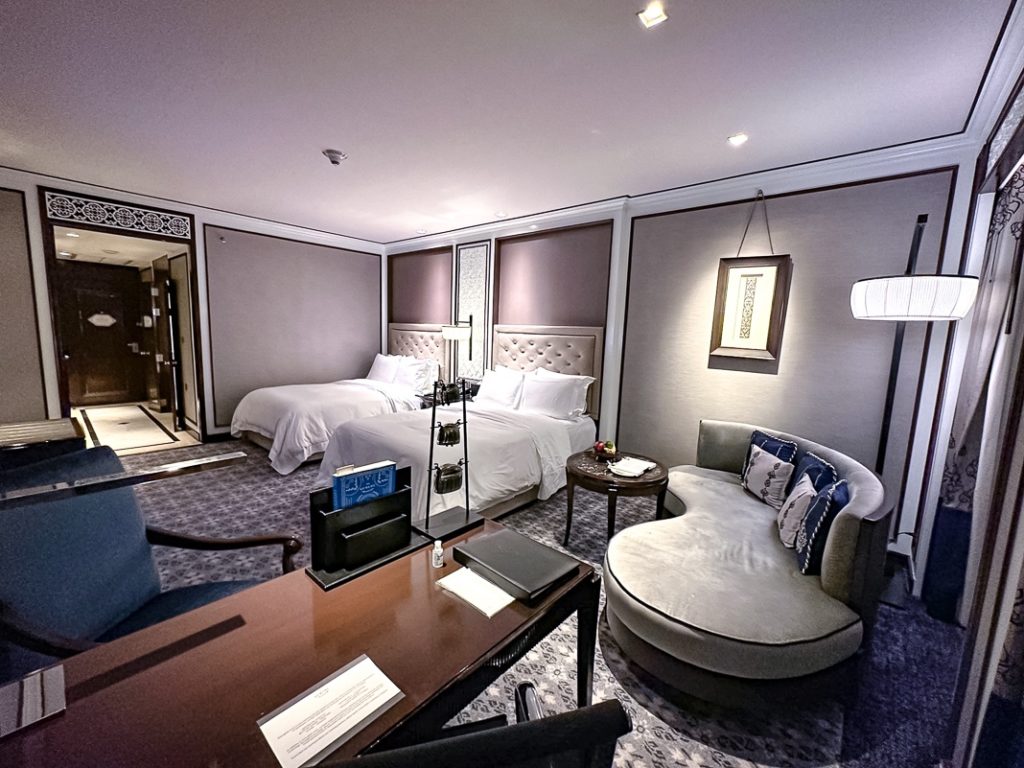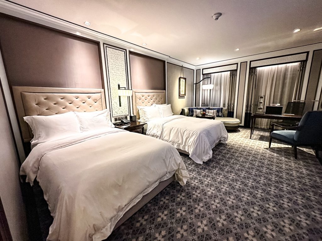 A notre arrivée, nous avons été immédiatement pris en charge par le voiturier pour nos bagages, qui ont été rapidement amenés avec nous à la réception. Grâce à notre statut Marriott Bonvoy, nous avons pu passer la file d’attente et être pris en charge immédiatement par l’agent de la réception, ce qui est toujours agréable. Comme nous étions trois, il y a eu un petit problème lors du processus d’enregistrement concernant le prix que nous devions payer pour la troisième personne (généralement le prix de la chambre + le prix d’un lit). L’agent nous a conduits au salon Royal Club, situé au 26e étage, pour finaliser la procédure d’enregistrement avec un responsable, au cours de laquelle des boissons nous ont été offertes.