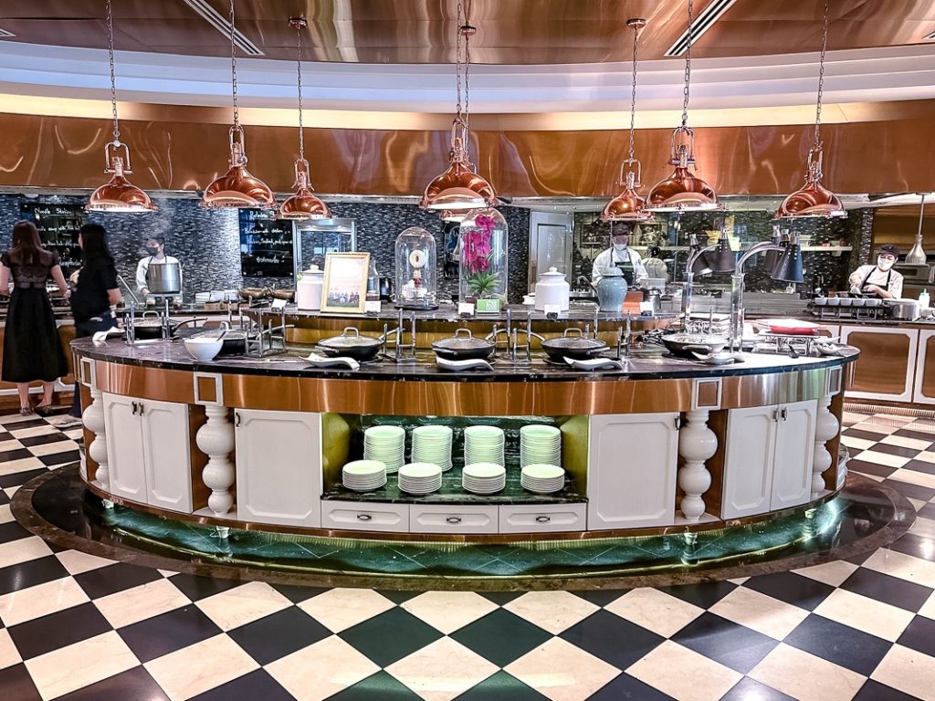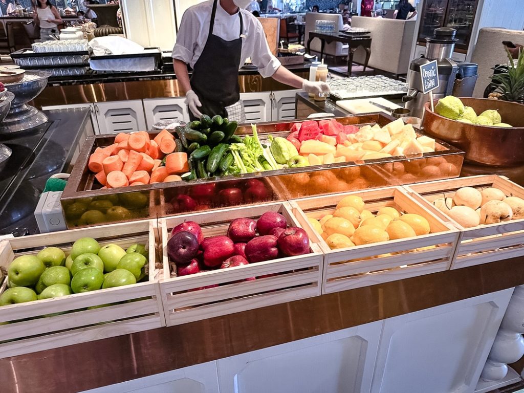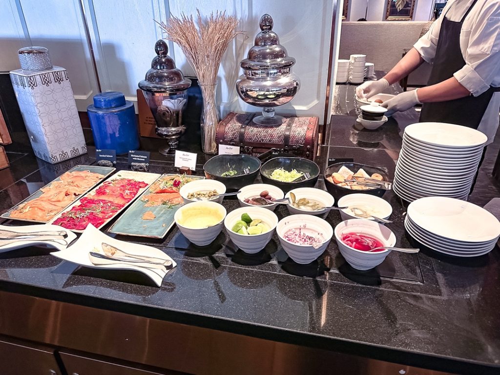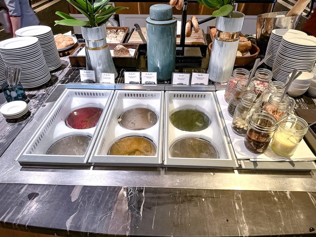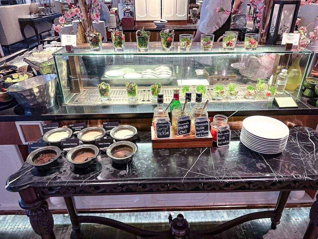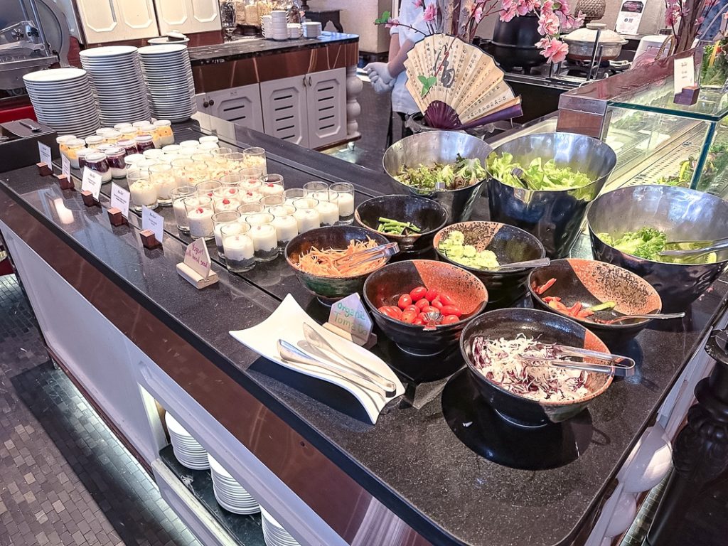 Il y avait une station de crêpes et de gaufres fraîches (le clou de nos petits-déjeuners), des plats asiatiques chauds et froids pour le déjeuner, une station de dumplings, une gamme complète de pâtisseries et de muffins fraîchement sortis du four, un stand de fruits frais et de jus de fruits, de la charcuterie et du fromage, ainsi qu’une grande sélection de glaces et de sorbets (vous avez bien lu). Nous pouvions également choisir dans un menu à la carte inclus, et il y avait également une station d’œufs, où vous pouviez commander vos œufs préférés. Tout ce que nous avons mangé était frais et délicieux, en particulier les plats d’œufs et les fruits frais.