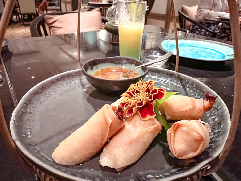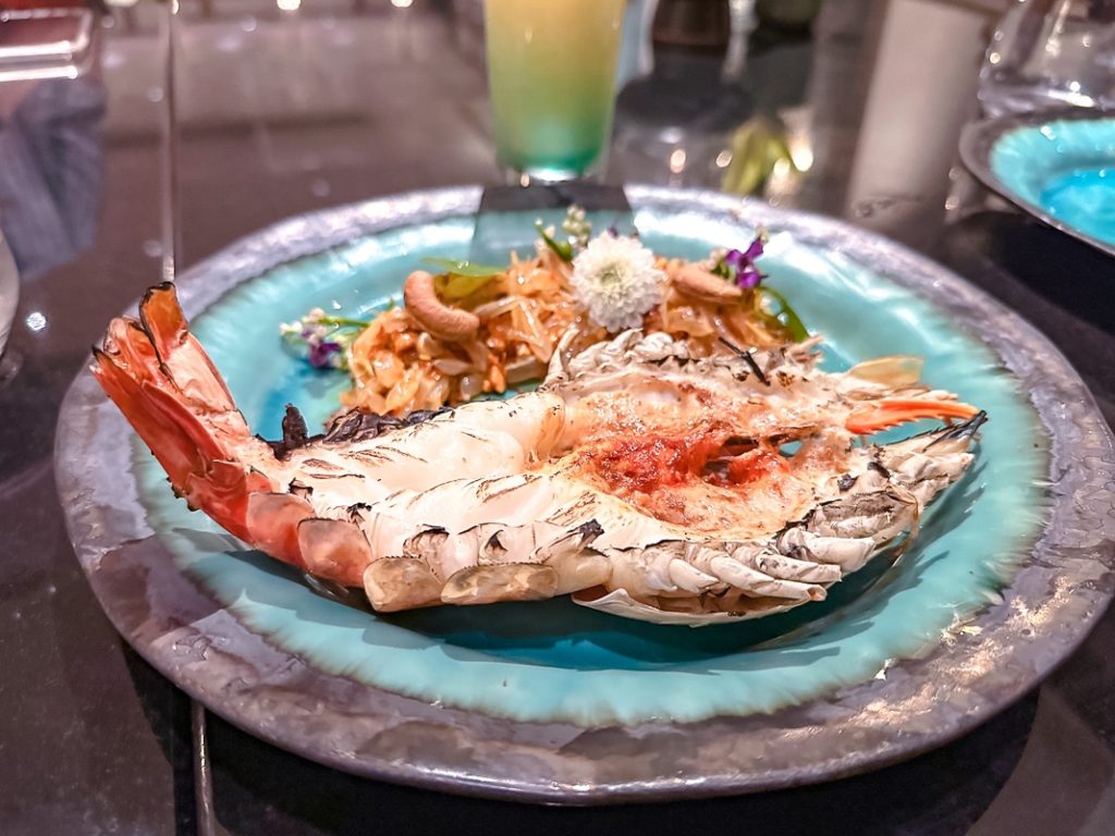 Pour les entrées, nous avons commandé les satays de bœuf Korat Wagyu (qui étaient servis avec un concombre sucré et épicé et une sauce aux cacahuètes), la salade de pomelo avec de la noix de coco et des crevettes de rivière et enfin les rouleaux de printemps aux crevettes frits (accompagnés d’une sauce aux prunes sucrée). Tous les plats étaient incroyablement savoureux et parfaitement présentés. Les entrées étaient tellement bonnes, nous étions impatients de goûter le plat principal !