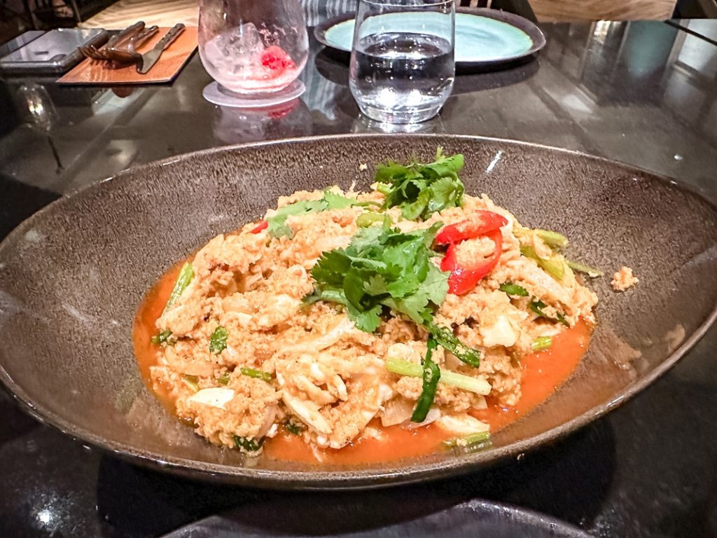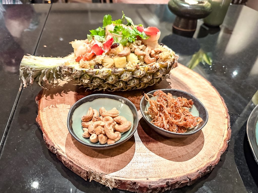 Ensuite, nous avons commandé le riz frit aux crevettes avec ananas et noix de cajou (une surprise, il est servi dans un ananas vide entier), la chair de crabe sautée avec poudre d’oeuf et de cari et enfin les crevettes de rivière entières frites à l’ail thaï et à la coriandre. C’était vraiment un festin pour les yeux et l’âme, et nous étions obligés de finir les assiettes même si nous commencions à être rassasiés, car tout était juste parfait.