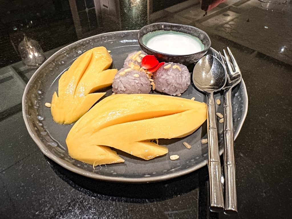 Finalement, nous ne pouvions pas partir sans avoir goûté à la carte des desserts, nous avons donc commandé chacun un des desserts traditionnels de la Thaïlande : Du riz gluant avec de la mangue fraîche et sucrée et de la crème de noix de coco. Une spécialité de la maison, c’était si simple, mais si savoureux, la conclusion parfaite d’une expérience culinaire vraiment exceptionnelle que nous recommandons à tous nos invités.