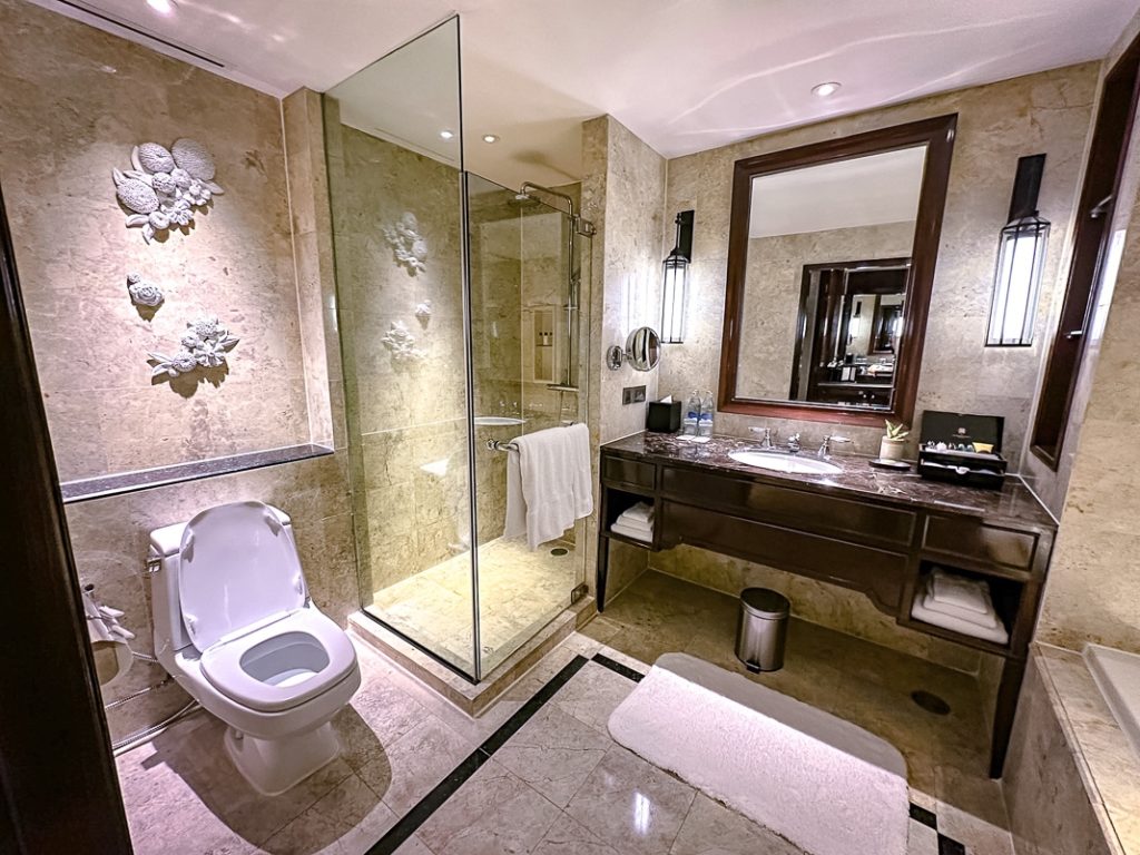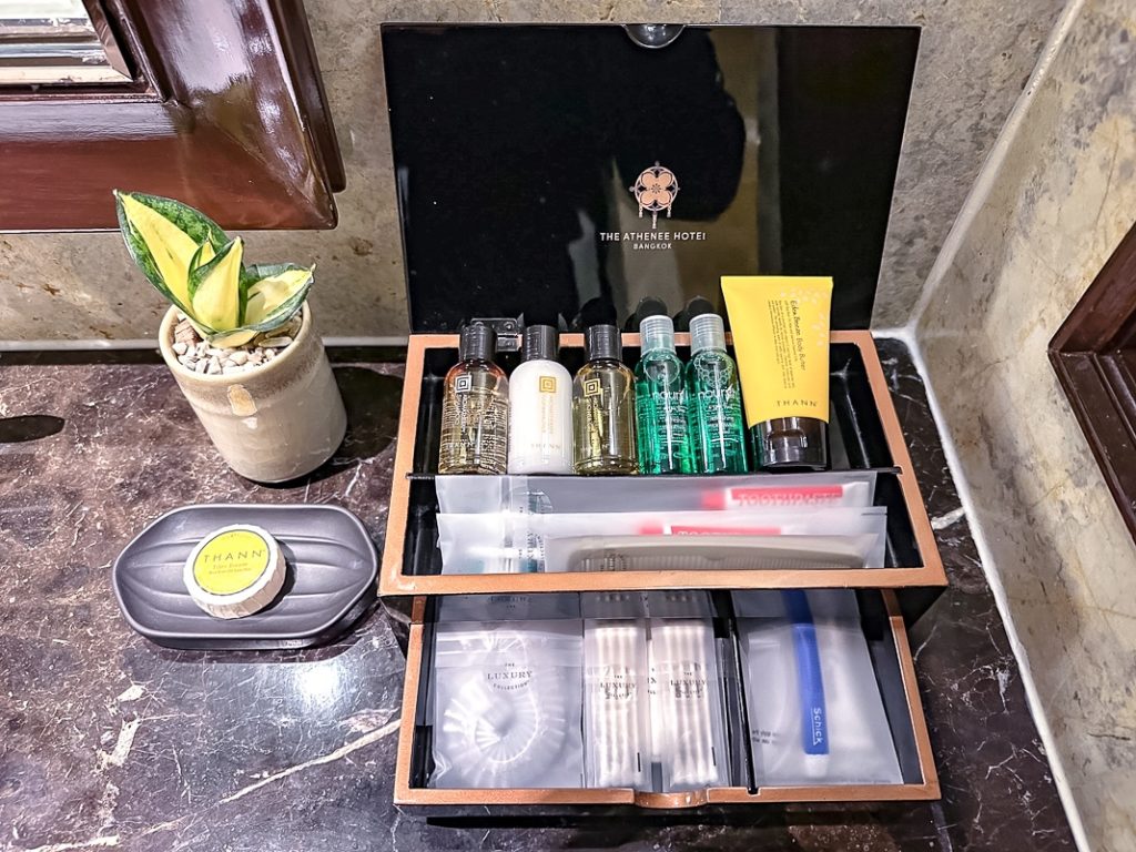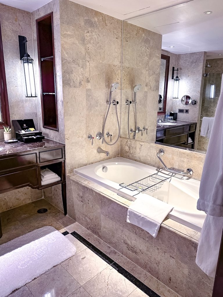 La salle de bain était très spacieuse, offrant à la fois une douche et une baignoire. Les produits d’hygiène personnelle étaient présentés dans une petite boîte noire laquée, ce qui ajoutait du style à nos rituels de soins. Nous sommes cependant un peu déçus de la marque avec laquelle ils ont choisi de travailler pour les produits, car Thann se trouve normalement dans les propriétés Marriott de rang inférieur, et nous nous attendions à quelque chose de plus luxueux pour une propriété Luxury Collection.