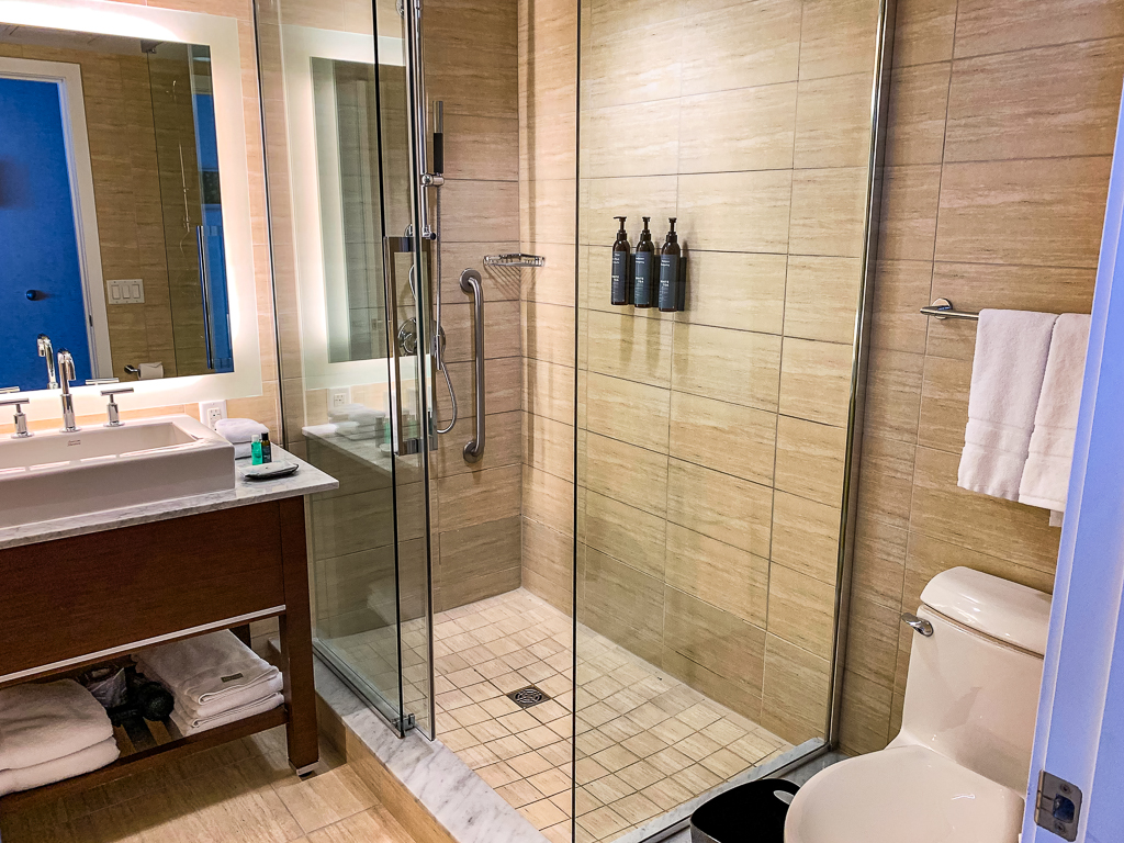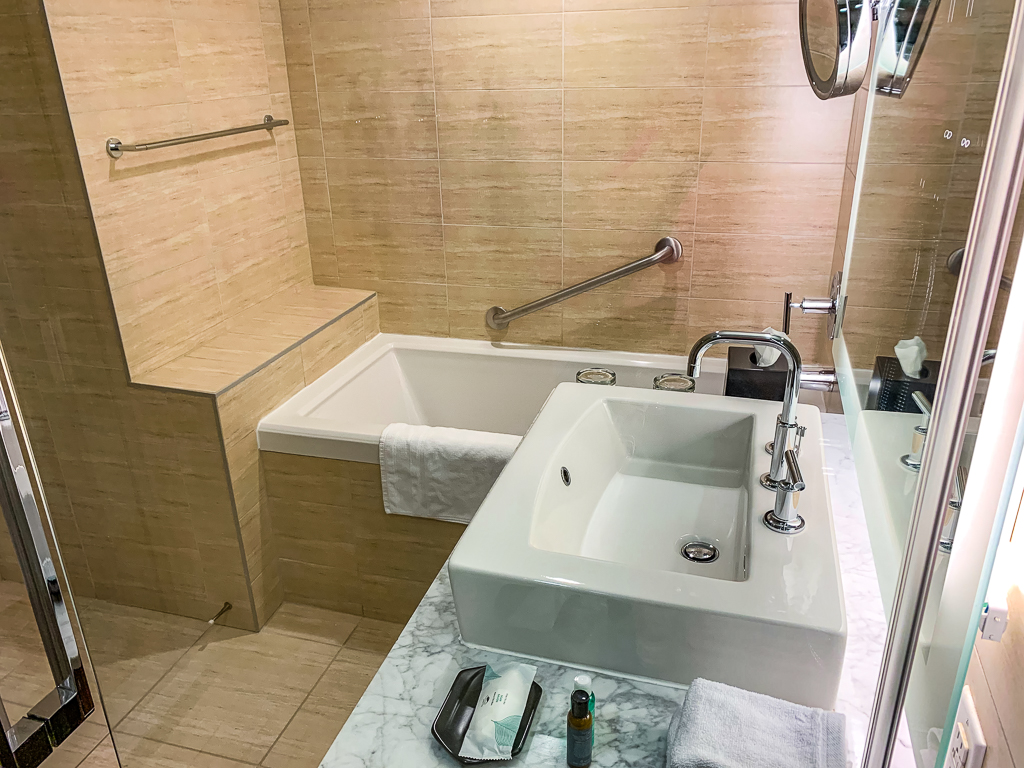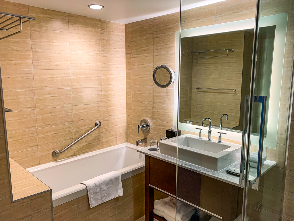 Nous étions au 15ème étage, juste en face de la porte du lounge de l’hôtel. Notre chambre était sur un coin, tout au bout du couloir.  Elle n’était pas particulièrement plus grande que les autres chambres de l’étage.