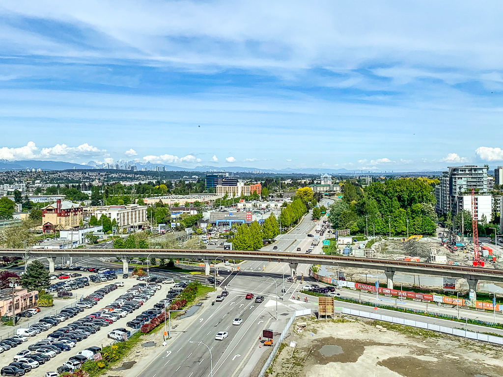 Un côté de la chambre donnait sur des tours à condos relativement neuves.  L’autre côté donnait sur le boulevard Sea Island Way, des terrains vagues et une entreprise de location de camions.