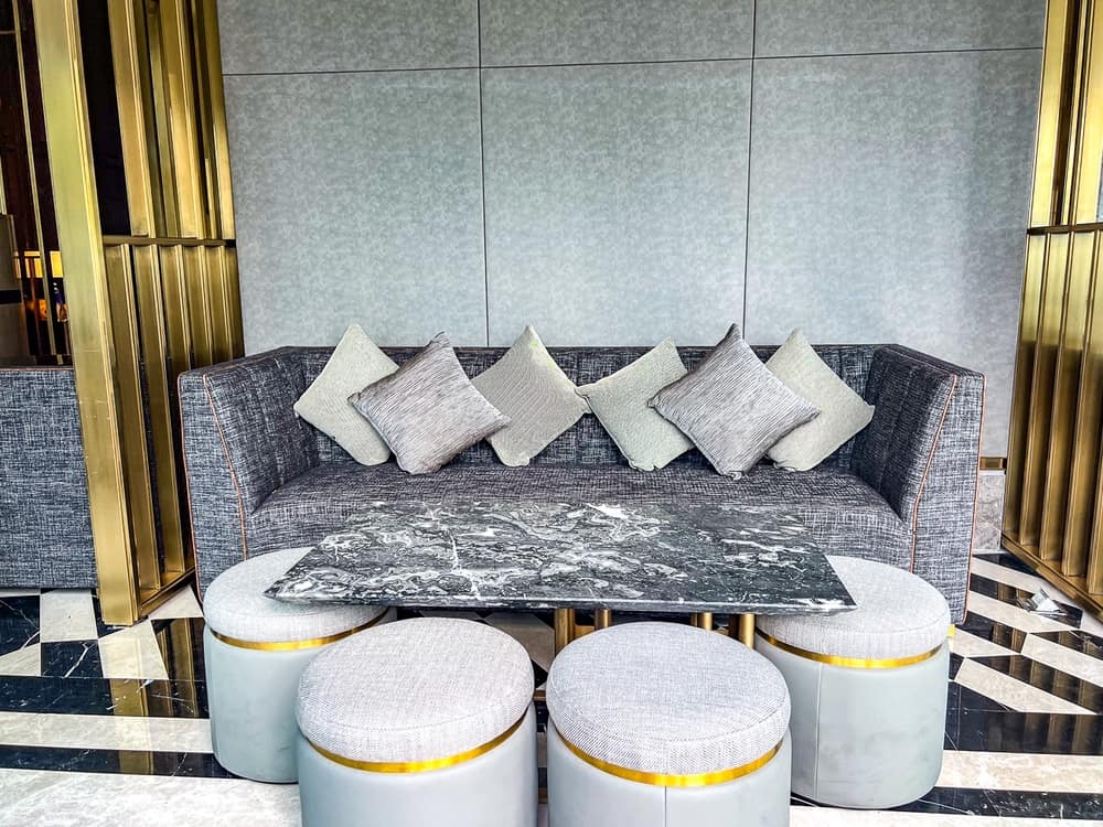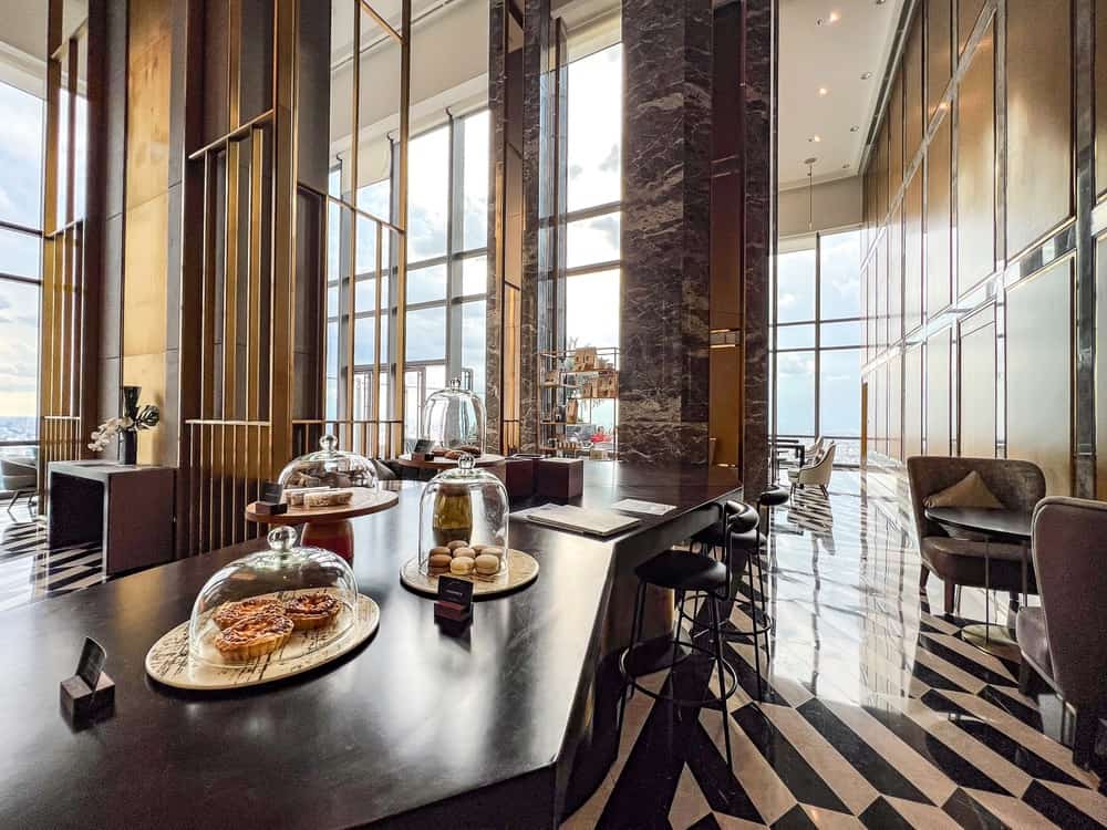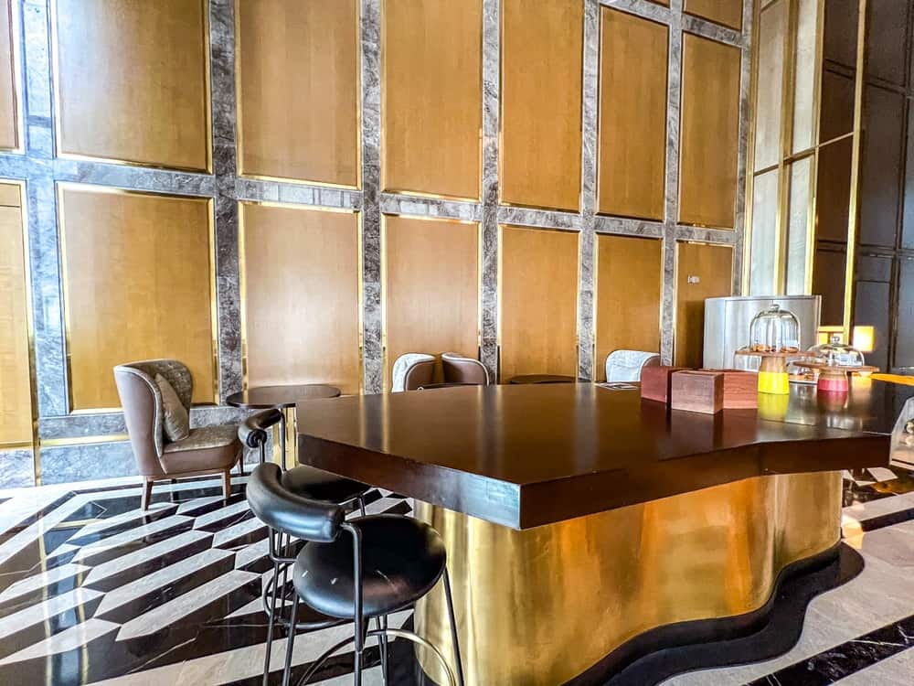 L’étage donne sur un hall d’entrée qui donne le ton sur le design élégant et raffiné de cet hôtel. On remarque instantanément les matériaux haut de gamme, marbre, lustres étincelants et mobilier de qualité, qui créent une atmosphère luxueuse. Les plafonds élevés combinés aux fenêtres du plancher au plafond créent une ambiance spacieuse et apaisante, en plus d’offrir des vues imprenables sur la ville.