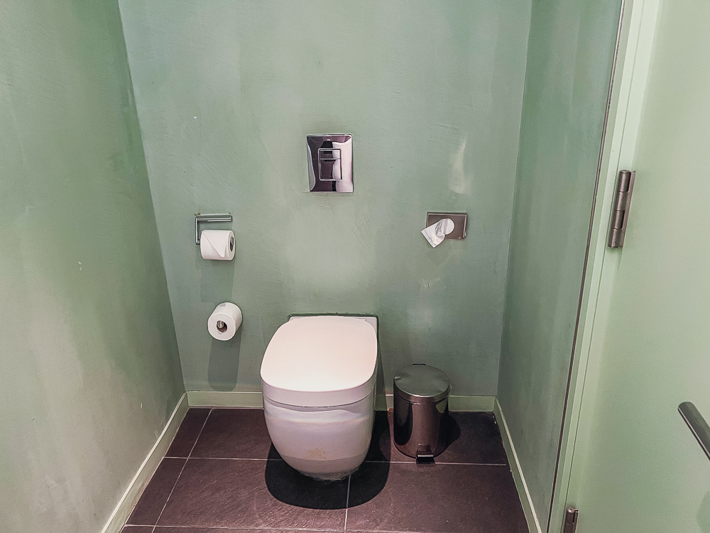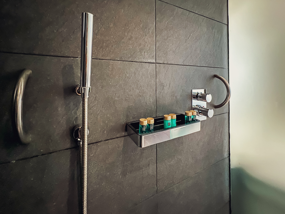 La salle de bain se trouve à côté de la chambre, mais n’est pas fermée par une porte, ce qui ne convient peut être pas à tous. On y trouve un plan avec une évier, une douche, une baignoire et des toilettes fermées ainsi qu’un espace pour se maquiller ou poser ses affaires.