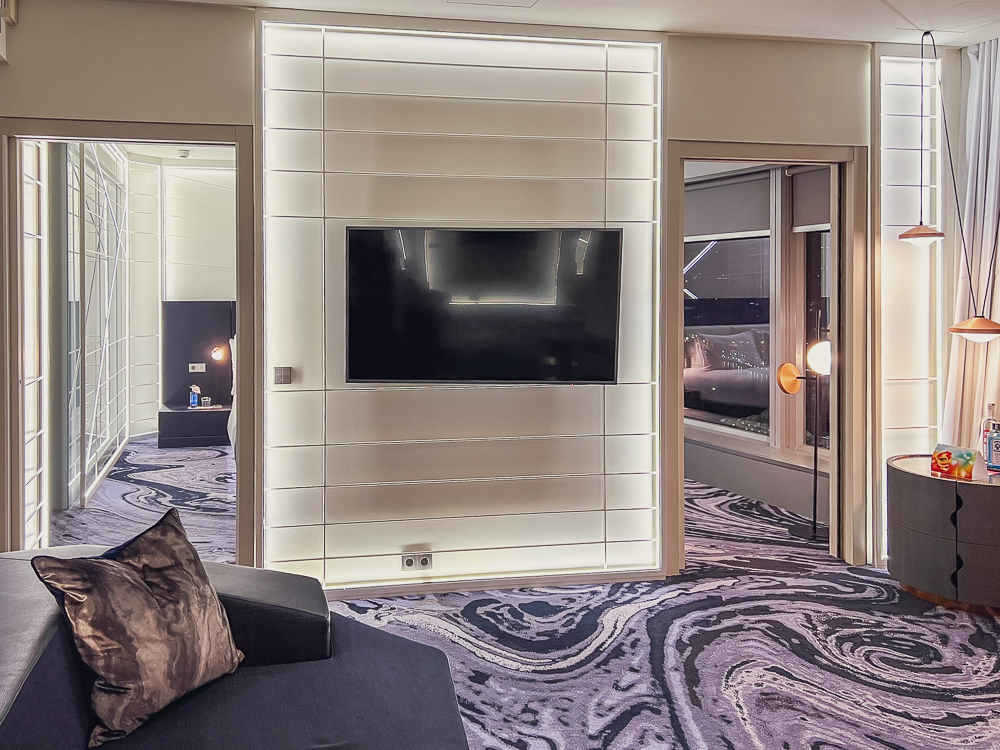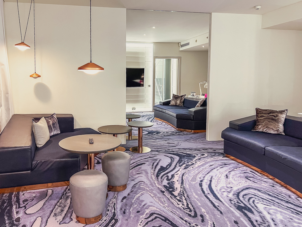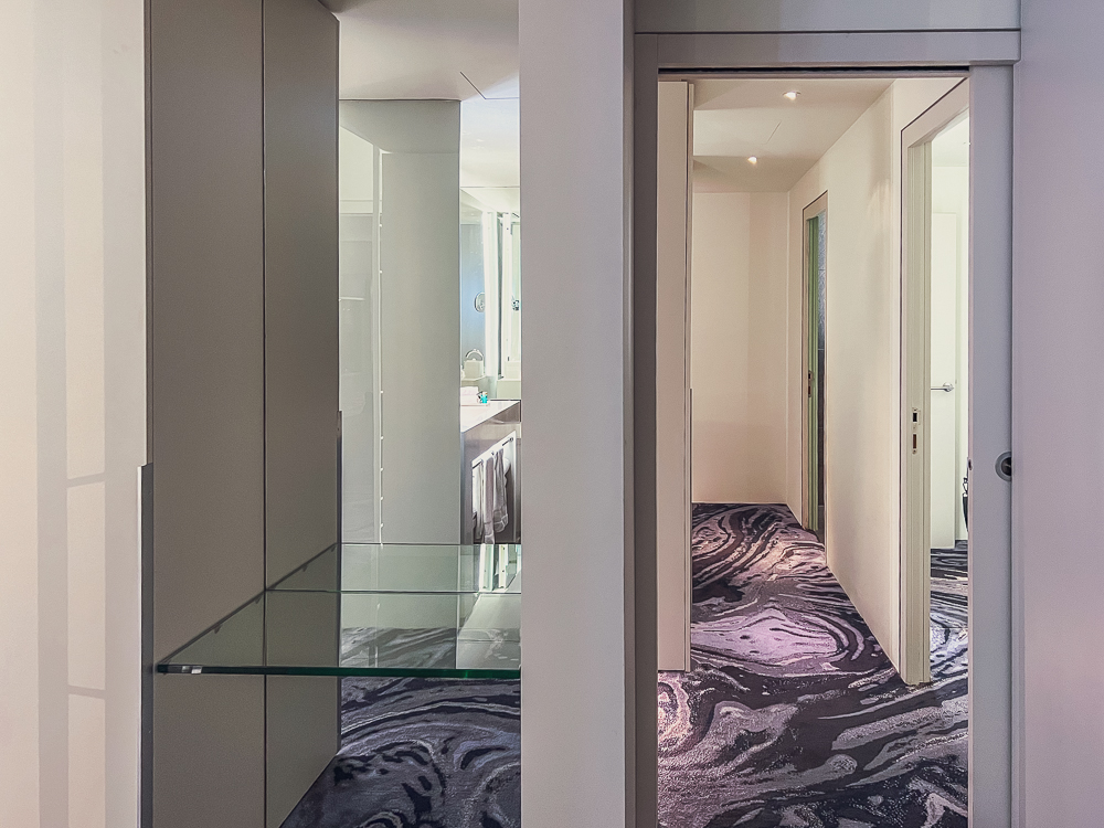On entre dans la grande suite par un petit couloir qui mène au bureau puis au salon. Un espace café et thé comme toujours est proposé dans l’entrée. Deux grands canapés composent le salon. Sur une table basse, un choix de bouteilles d’alcool incite à la fête déjà. Un grand miroir dans le salon donne un sentiment d’espace.