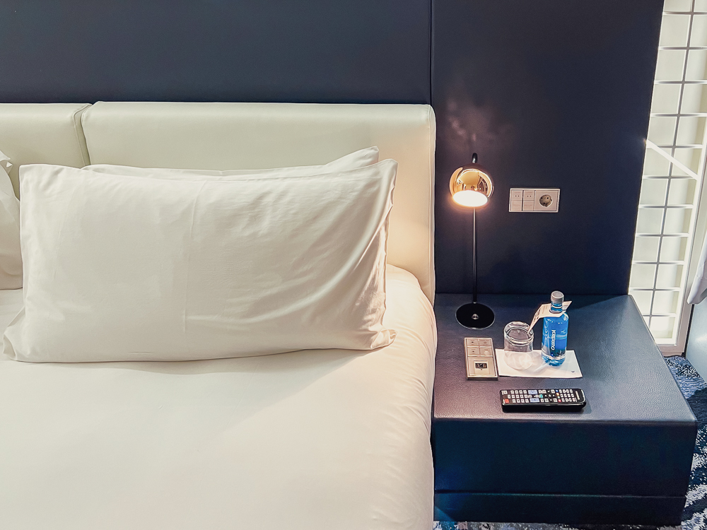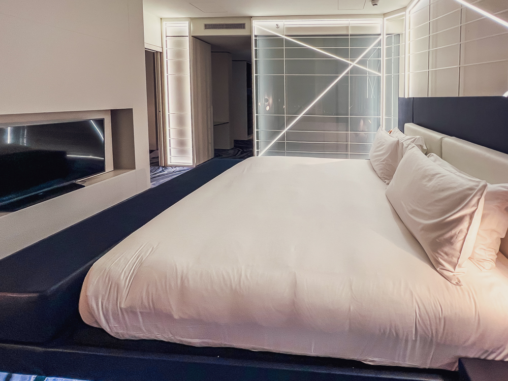 À côté se trouve la chambre avec un lit king confortable avec une banquette à son bout. L’espace est agréable dans des tons neutres reposants. Une seconde télévision est disposée face au lit, intégrée dans une niche au mur.