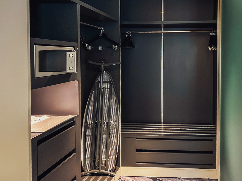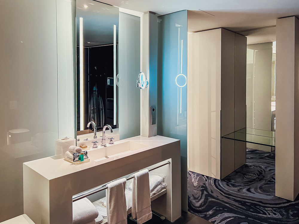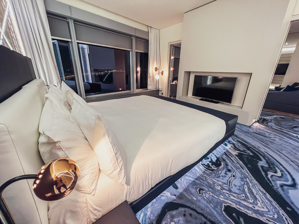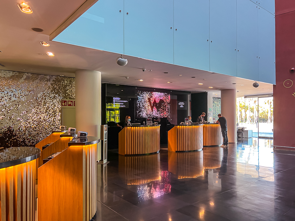 Il inclus 473 chambres dont 67 suites. À l’image des hôtels W, cet hôtel luxueux est coloré, vibrant. L’entrée de l’hôtel impressionne par son immense paroi, éclairée la nuit, qui monte au ciel et ses murs pailletés.