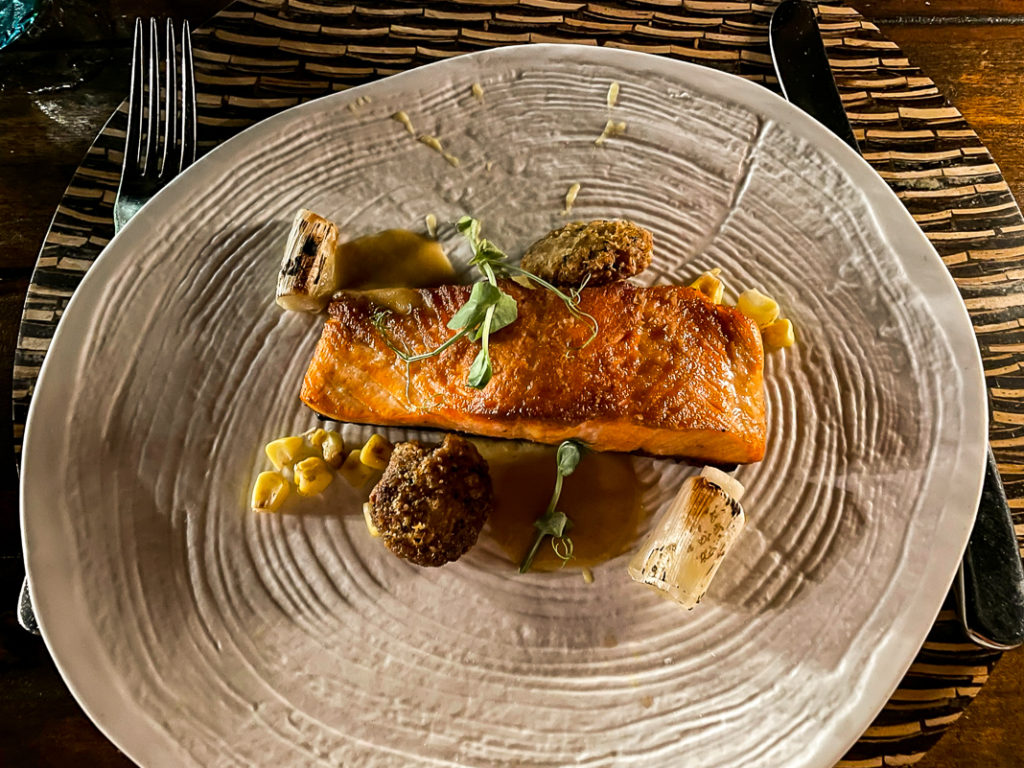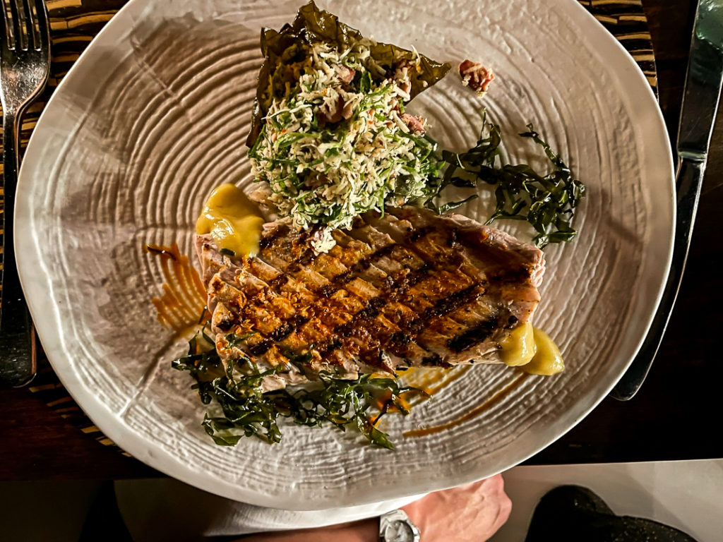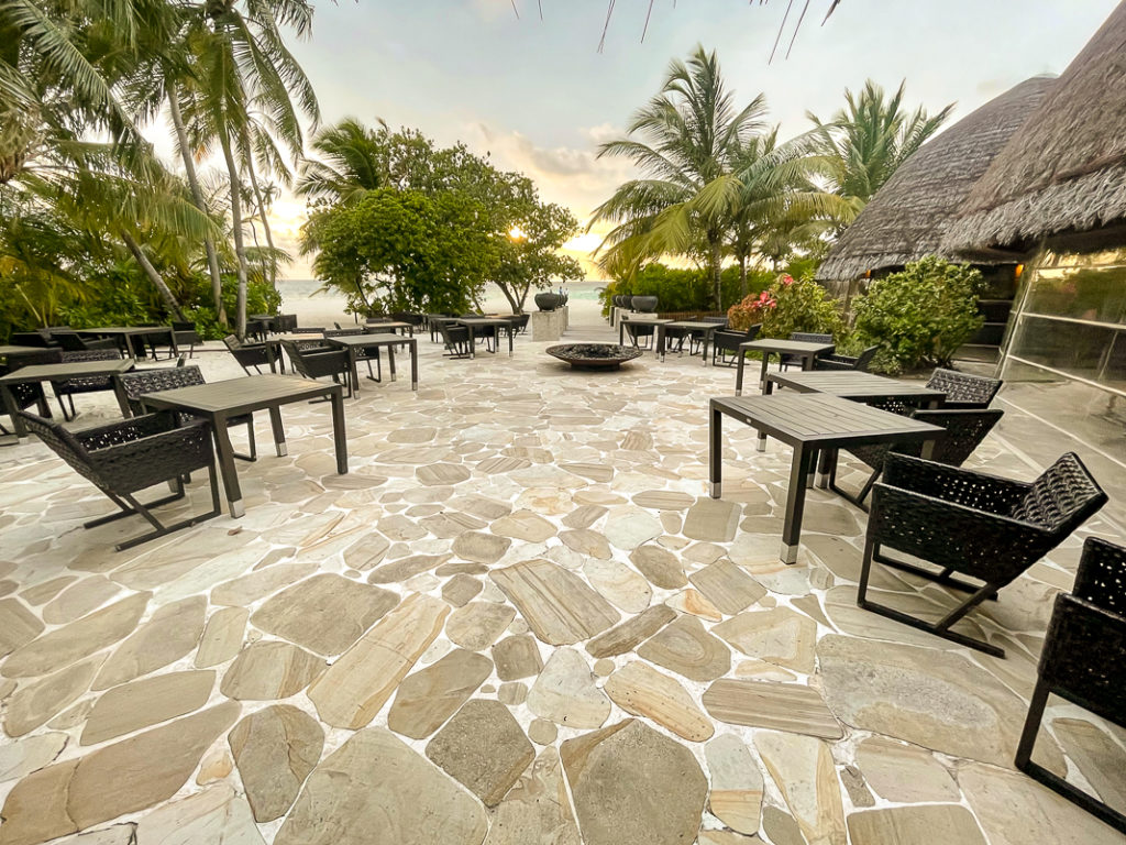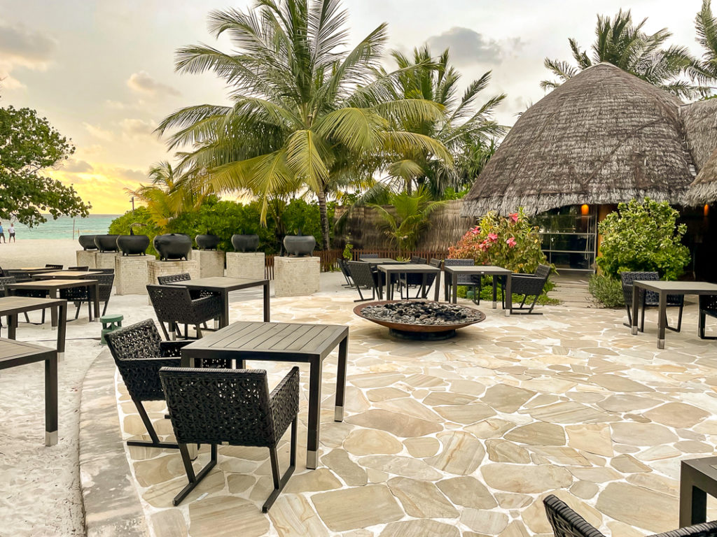 Nous y avons soupé un soir seulement, car, comme vous vous en doutez, l’approvisionnement en viande aux Maldives est plus complexe que celle en produits de la mer et forcément les prix sont en conséquence. Cela étant dit, notre repas était excellent. L’ambiance du restaurant est sympathique avec son foyer. La vue y est plus limitée et conventionnelle, le restaurant étant entouré de végétation et sur la terre ferme.