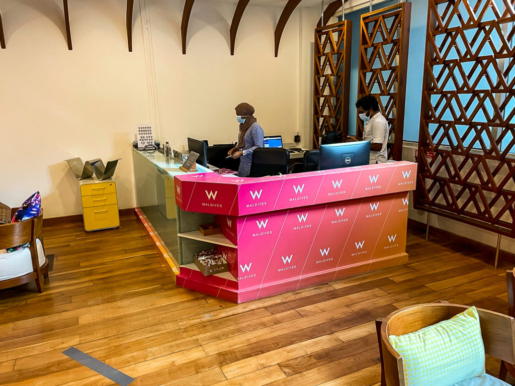 Ayant pris un vol de nuit à partir d’Abu Dhabi (AUH), nous sommes arrivés vers 8h00 du matin à Malé. La très grande majorité des hôtels dispose d’un représentant sur place qui accueille les invités. C’est notamment le cas du W Maldives.