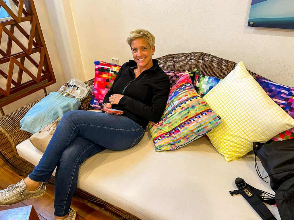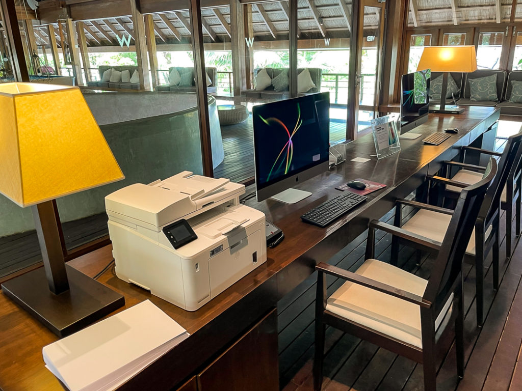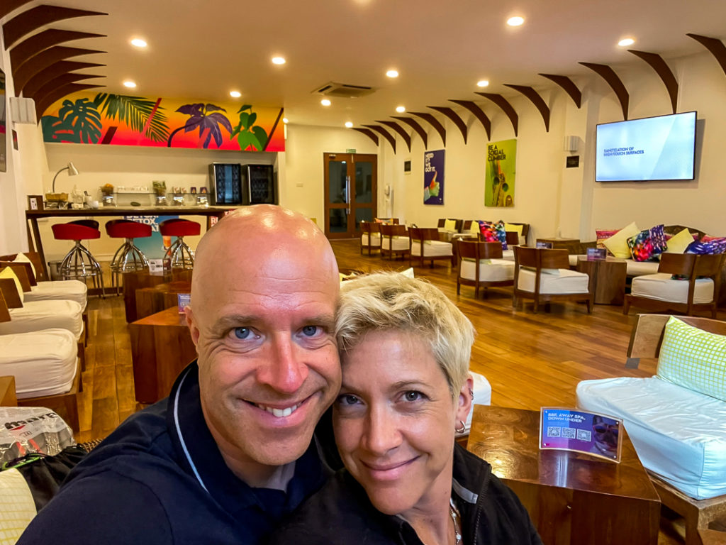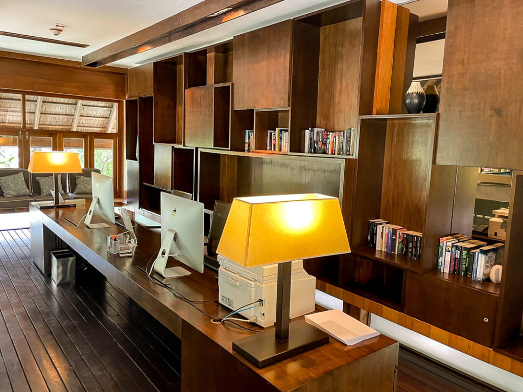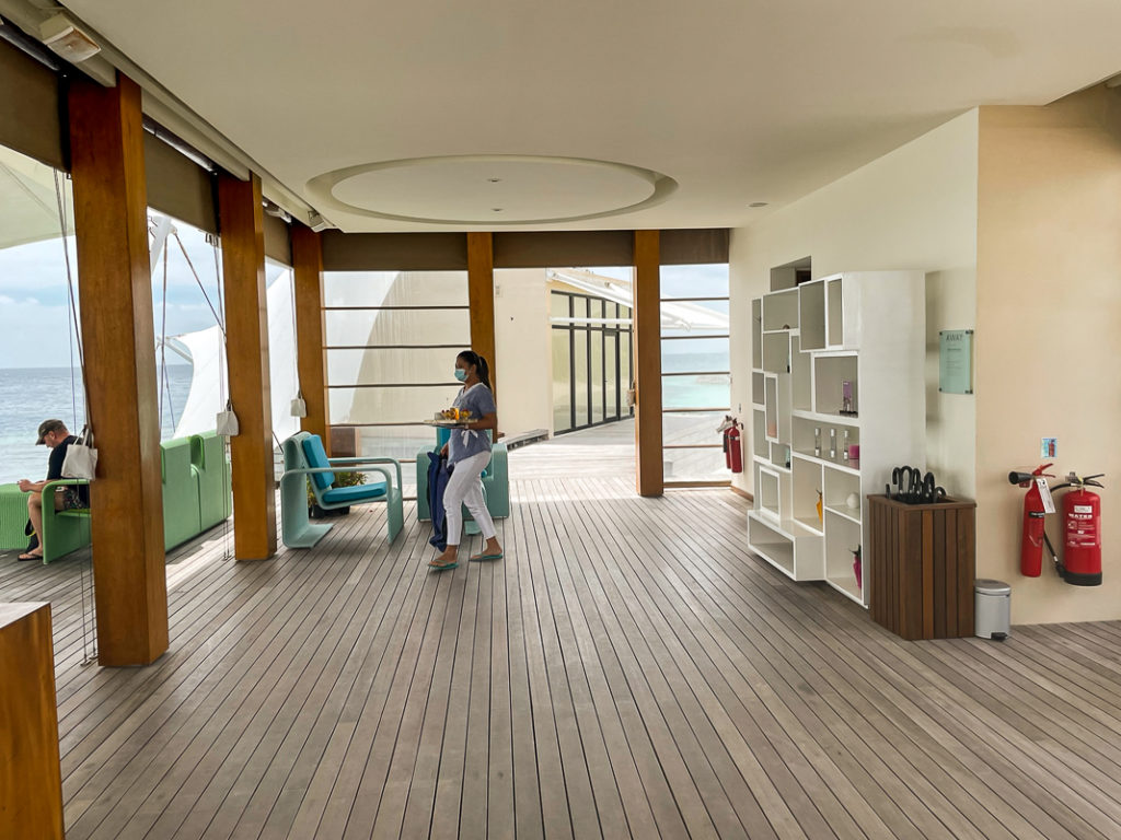 Toutes les formalités de check-in seront effectuées ici au lounge. C’est vraiment une belle attention, car plus tard lorsque nous débarquerons de l’hydravion au resort, nous n’aurons pas à passer par la réception. C’est donc à ce moment que nous devrons « confirmer » notre chambre pour le séjour.