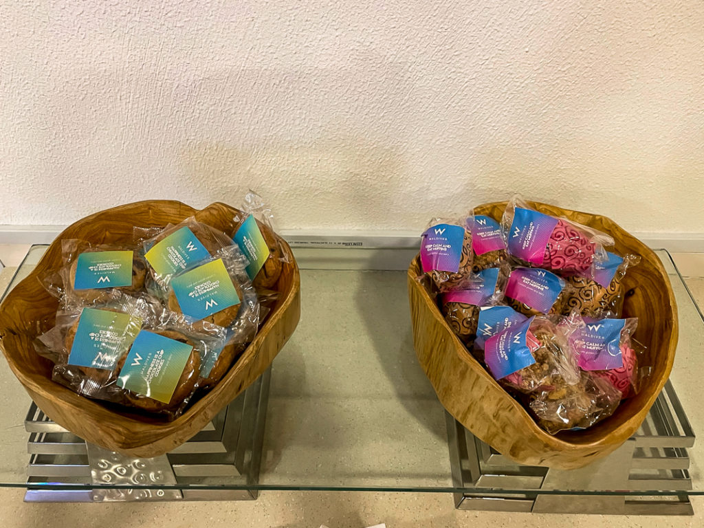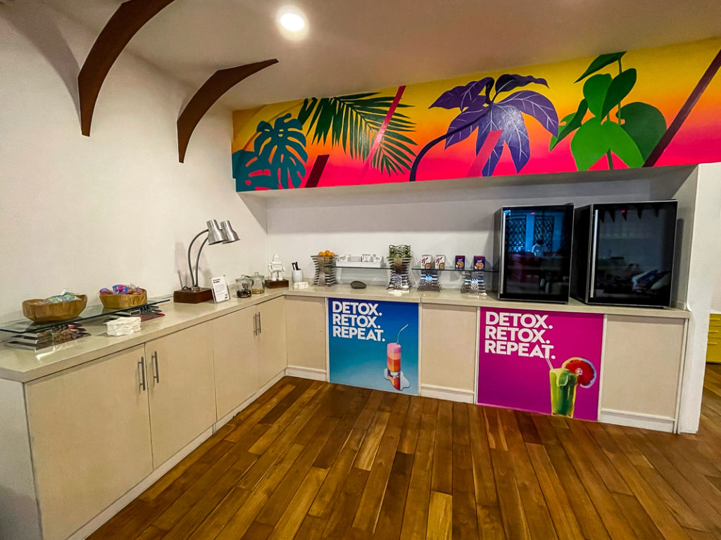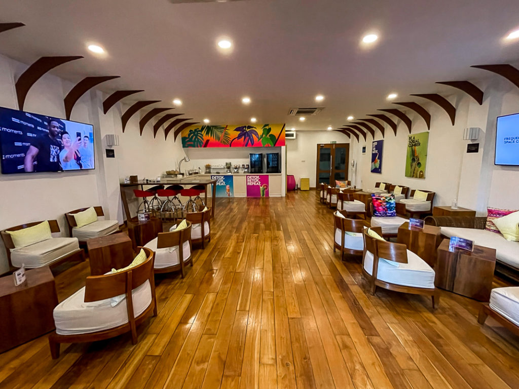 Le lounge dédié est fort sympathique et il affiche déjà la thématique phosphorescence qui caractérise le W Maldives. Le thème de la phosphorescence est inspiré de la méduse phosphorescente et du plancton lumineux pouvant être aperçu sur les rives de l’île privé du resort.