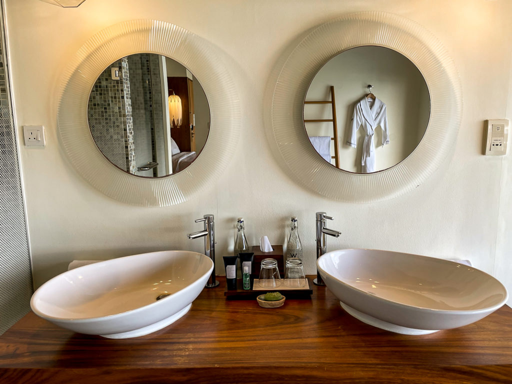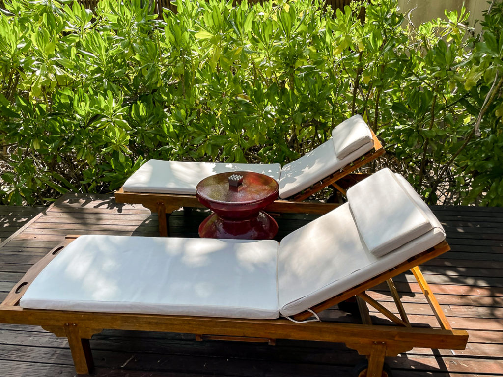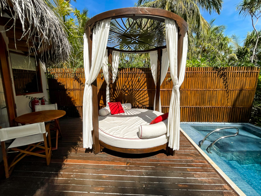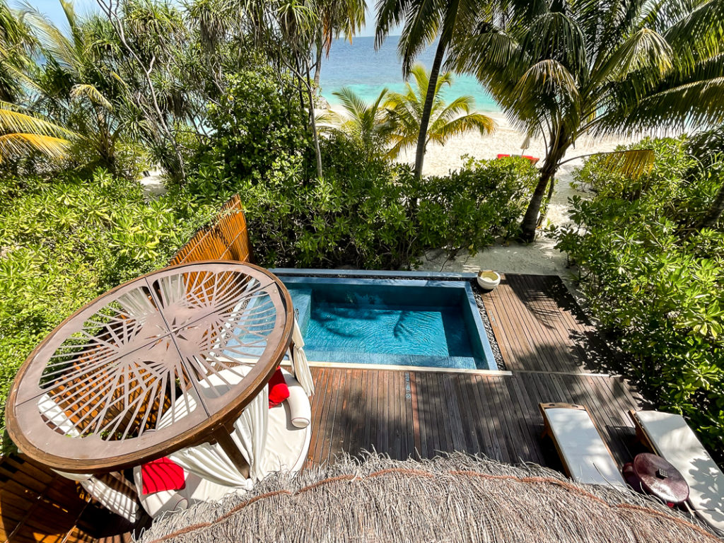 La villa sur plage du W Maldives constitue ma préférence versus celle sur pilotis. Certes nous ne sommes pas directement au-dessus de l’eau toutefois l’abondance de la végétation, le calme plus présent car mieux protégé du vent, la salle de bain atrium et surtout cette proximité immédiate avec la plage en font une oasis idéale. La villa sur plage est vaste et très confortable, ses options pour se balancer (hamac dans la chambre et canapé balançoire sur la terrasse de toit) y ajoutent une petite touche unique.