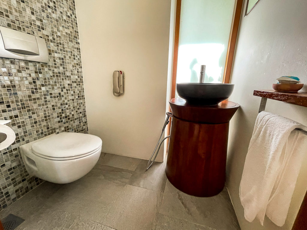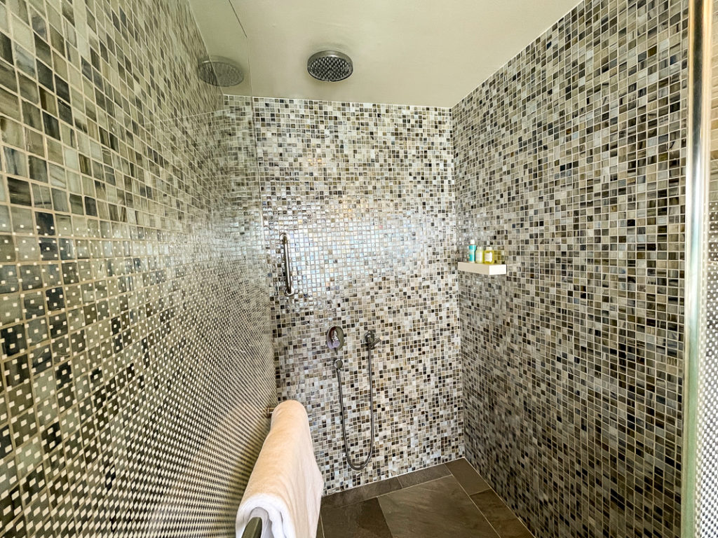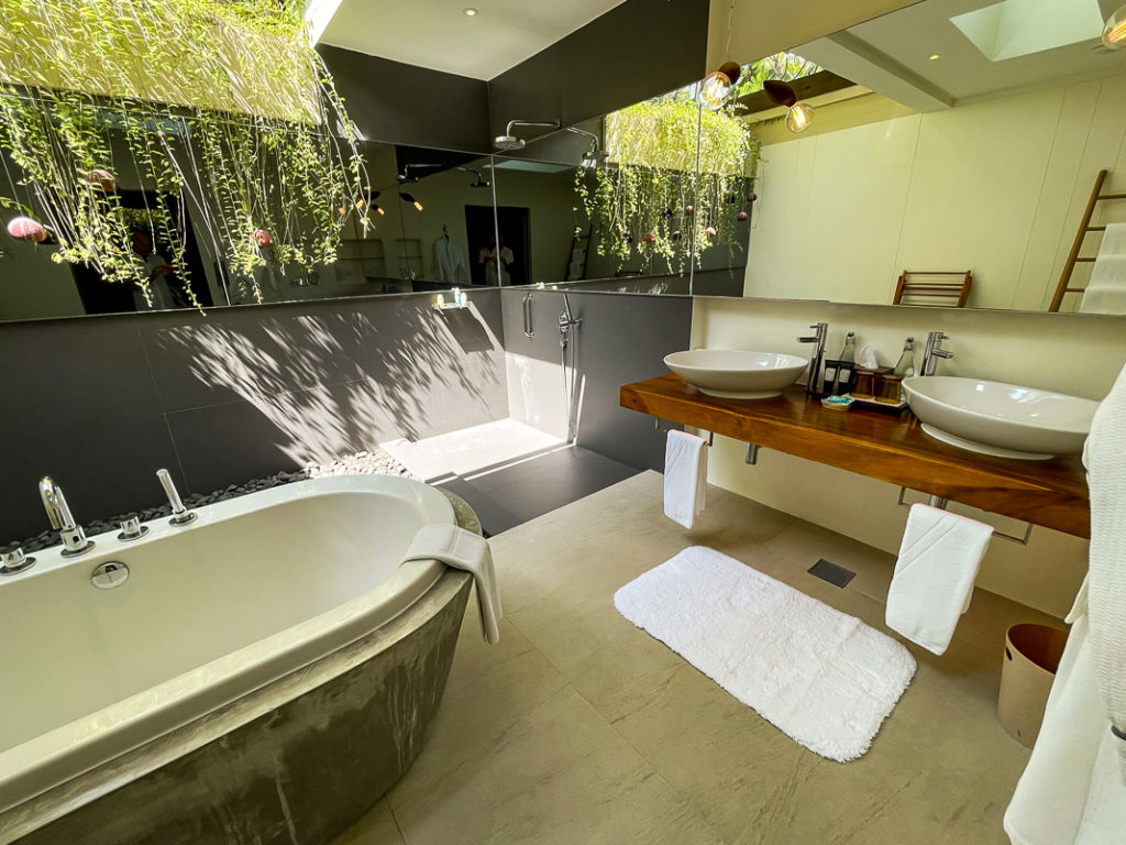 Certes nous n’avons pas la vue sur l’océan toutefois la proximité de la végétation qui y pénètre par l’ouverture du plafond et se reflète dans les grands miroirs crée une ambiance propice à la détente. Comme il est ressourçant d’y prendre sa douche matinale sous la douche-pluie alors que l’eau mêle sa caresse à celle du soleil sur nous, que nos pieds foulent les ardoises réchauffées par ses rayons…