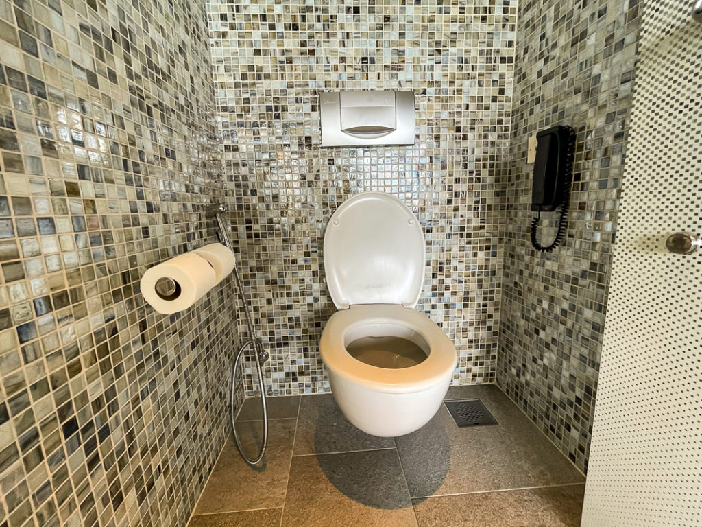 La zone des lavabos est protégée par une protubérance du plafond et on peut l’utiliser même s’il pleut. Pour des raisons évidentes d’intimité, mentionnons que la toilette quant à elle se trouve dans une pièce annexe, totalement fermée.