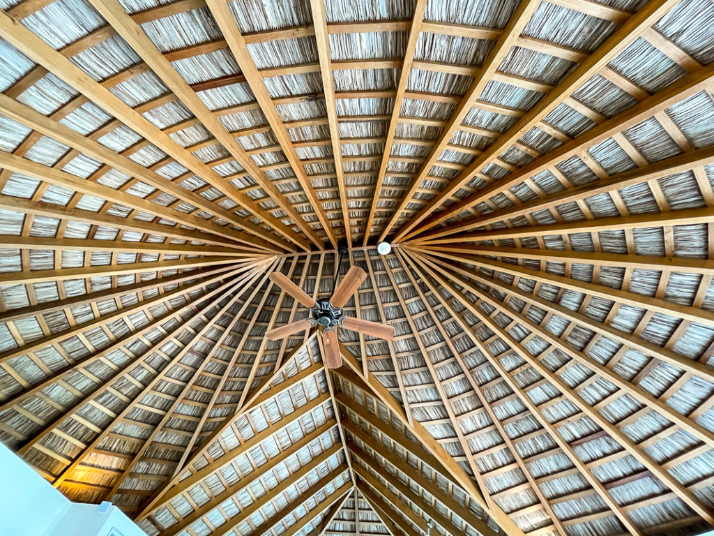 La terrasse de toit s’accède via un escalier latéral extérieur. Couverte par toit cathédral en feuilles de palmier tressées, similaire au plafond intérieur de la villa sur pilotis, elle offre une belle alternative à la détente.