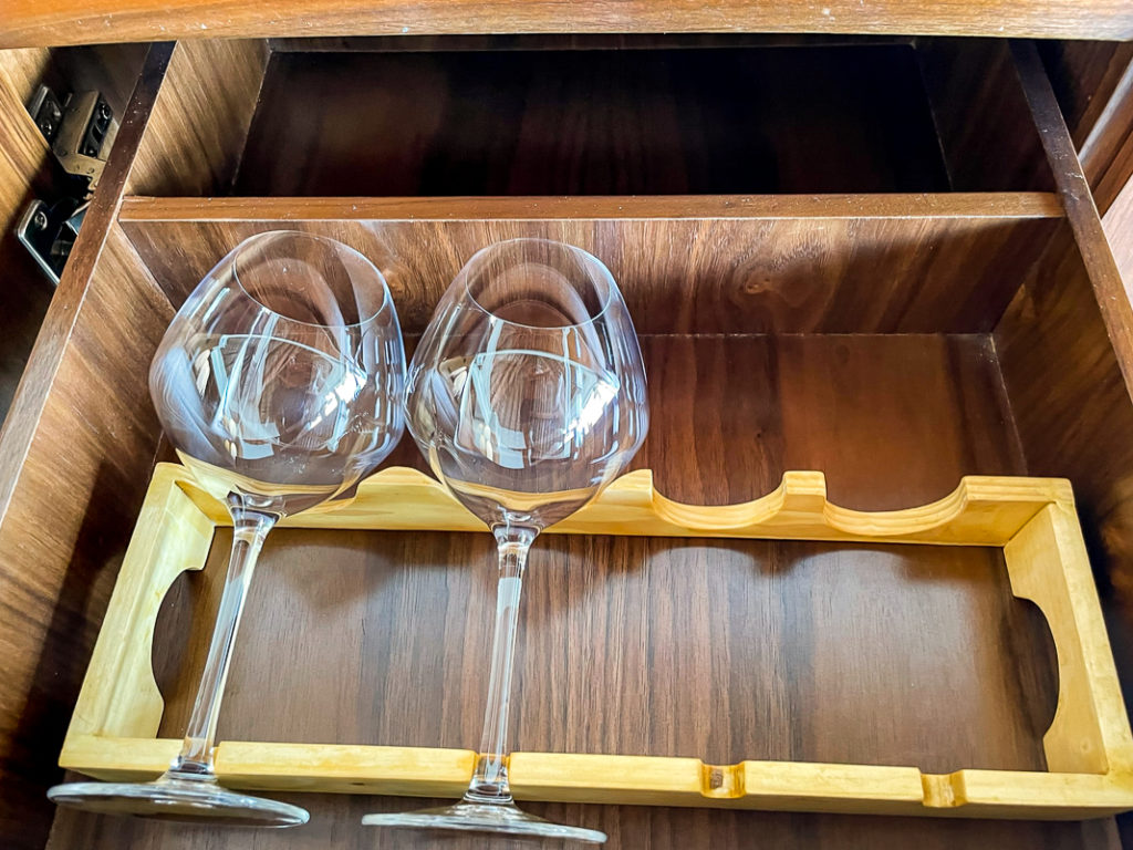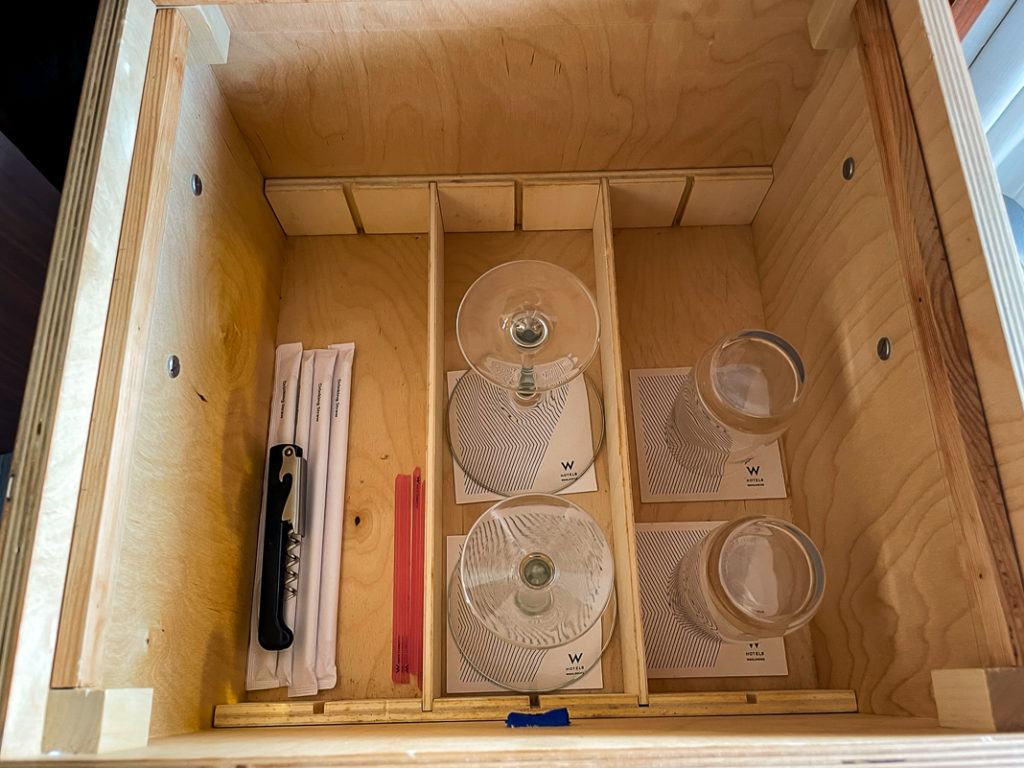 Le lounge contient de quoi se « ravitailler » en termes de victuailles et de consommations. On y trouve aussi des bouchons d’oreille pour l’hydravion. Certains trouveront en effet que le son des hélices résonne énormément dans la petite carlingue exiguë de l’hydravion.