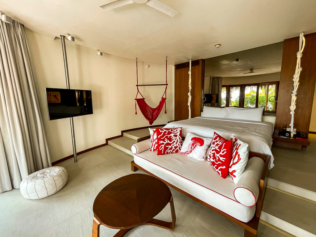 Dès que l’on ouvre la porte de notre chambre, nous sommes charmés par cette « bulle » qui nous hébergera. De forme ovale la chambre est très lumineuse avec ses 4 grandes portes patio donnant sur l’océan, son lit king adossé à un grand miroir plein mur, son espace salon-détente doté d’une ouverture vitrée au plancher rappelant que nous sommes bel et bien sur pilotis, son toit cathédral en feuilles de palmier tressées.
