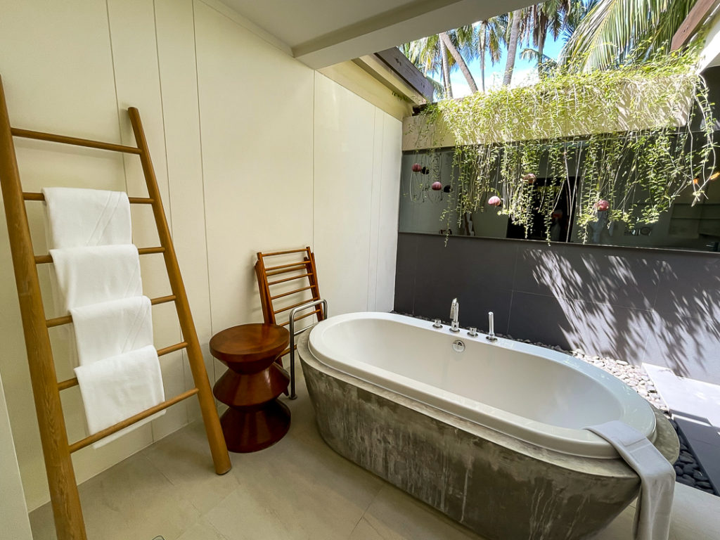 La salle de bains de la villa sur plage est très différente de celle sur pilotis. D’une part elle est située derrière la chambre plutôt qu’à côté, mais surtout il s’agit d’un atrium à ciel ouvert. Le soleil, tout comme la pluie d’ailleurs, peut y pénétrer.