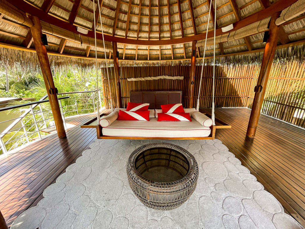 Le mobilier principal est un grand canapé de type balançoire donc suspendu. La vue de cette terrasse est sympathique et elle permet de mieux voir les nombreuses chauves-souris qui habitent l’atoll et se prélassent dans les palmiers le jour.