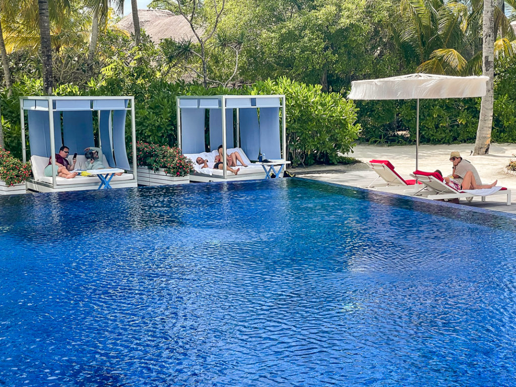 La piscine du W Maldives est de type infinity et elle permet à ceux qui le désirent, de faire des longueurs. Plus tranquille le matin, elle tend à être plus populaire durant le jour alors que les familles tendent à s’y installer.