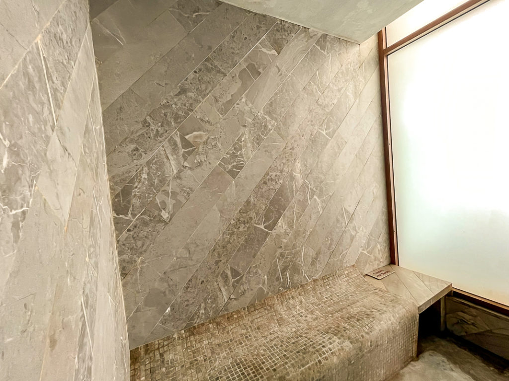 Un grand comptoir muni de deux éviers offre à chacun l’option d’y aller à son rythme pour les ablutions matinales ou encore les préparatifs d’une soirée festive. S’y trouve également une grande douche pluie dont la céramique mimique l’hétéroclite motif des grains de sable.