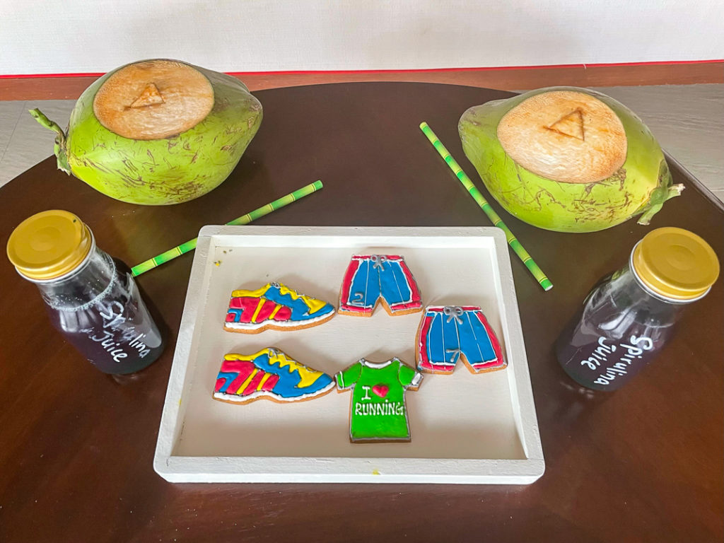 Je me suis même lié d’amitié avec le chef cuisinier de l’hôtel (depuis rendu au W Bali – je vais même essayer d’aller l’y retrouver lors d’un prochain voyage). Un matin, nous avons couru ensemble sur l’atoll (c’est un coureur) pour ensuite étancher notre soif avec de précieuses noix de coco. Il a même fait parvenir à notre villa des biscuits de pain d’épice en forme de short, t-shirt et souliers de course.