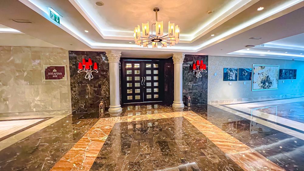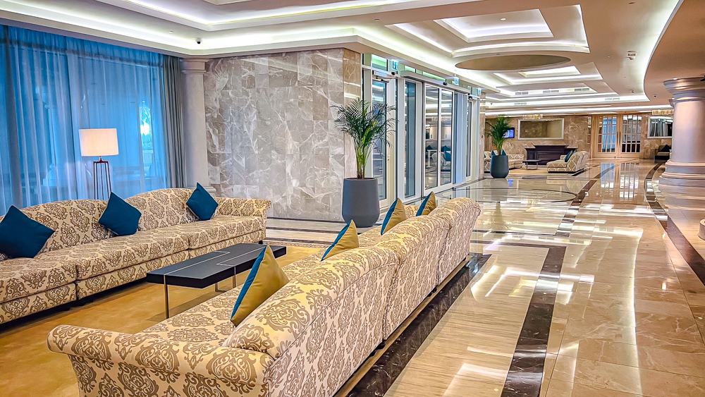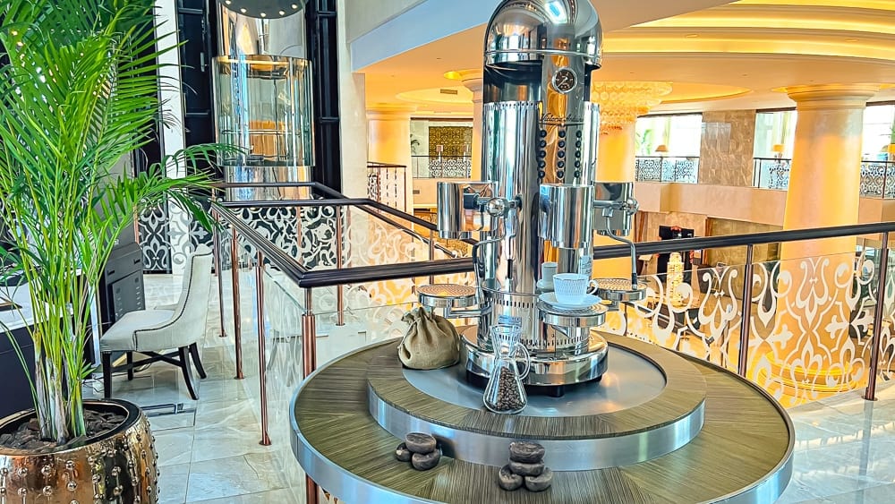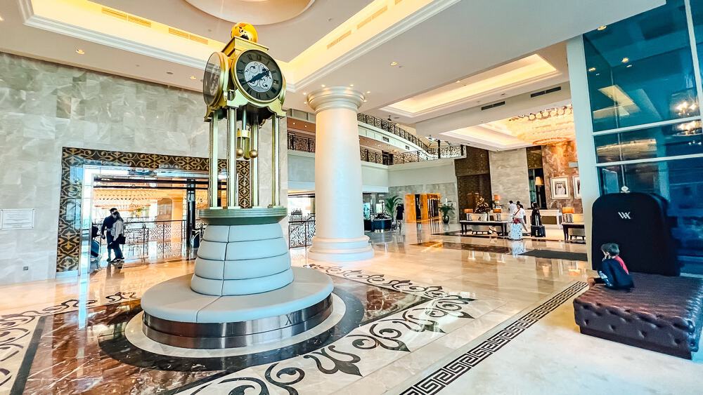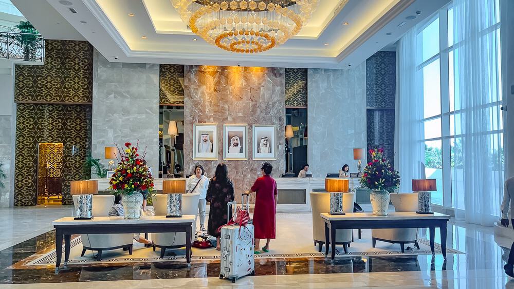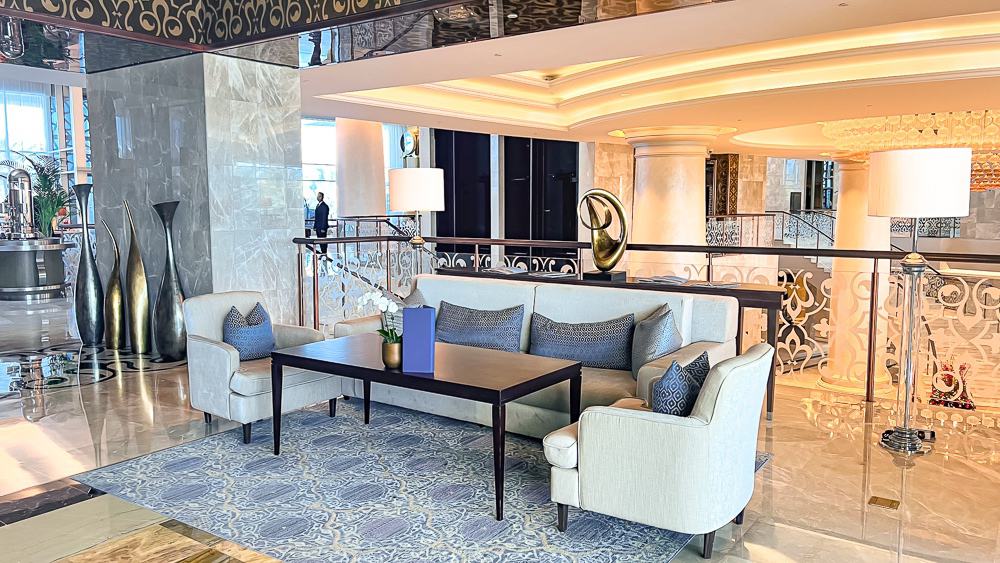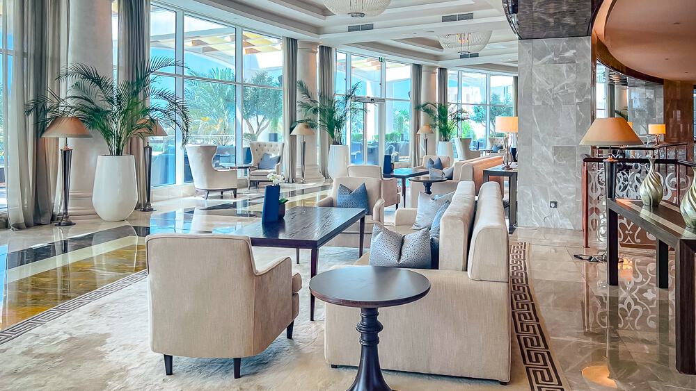 Installé sur l’emblématique Palm Jumeirah, l’hôtel à Dubaï, Waldorf Astoria Dubai Palm Jumeirah est imposant. Ce resort luxueux des plus élégants est appréciés pour sa longue plage de sable fin et sa nombreuse liste de services que nous détaillerons. Dès notre arrivée, nous sommes transportés par les belles mélodies d’une pianiste, installée dans un salon accoté à la réception.