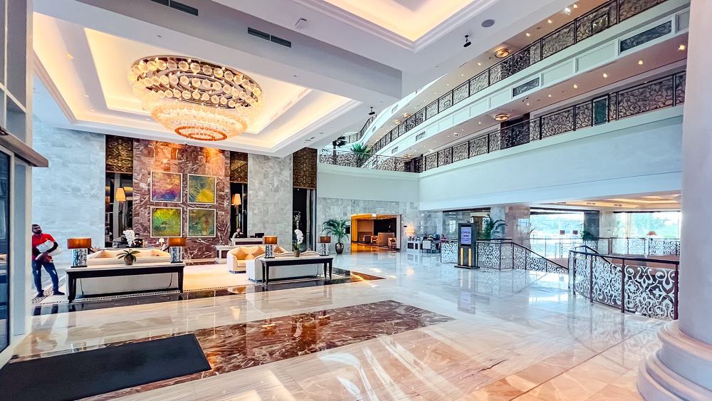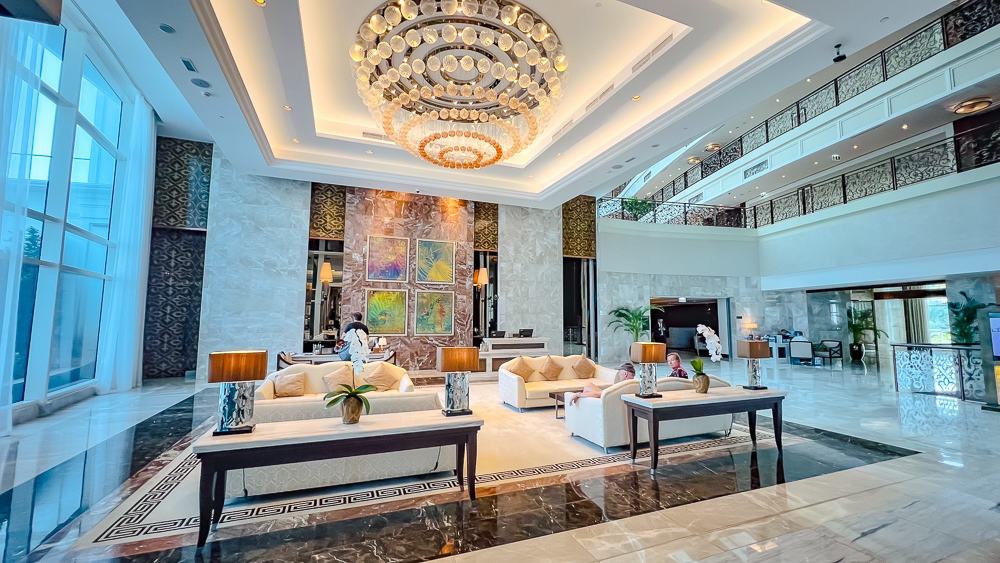 Une fois garé à l’entrée de l’hôtel, les valets ont pris en charge notre voiture pendant qu’un des maîtres d’hôtel s’est occupé de nos valises. Nous avons été invités à nous rendre au comptoir d’enregistrement situé sur la droite.