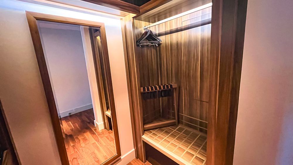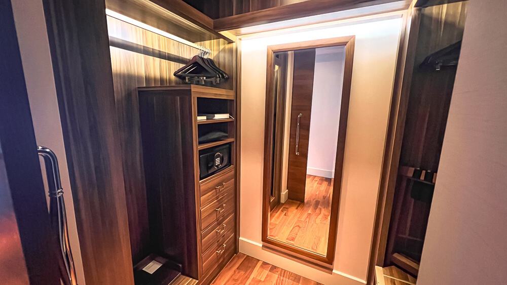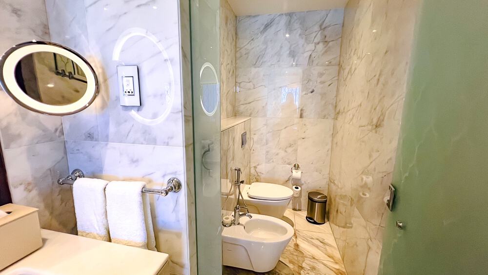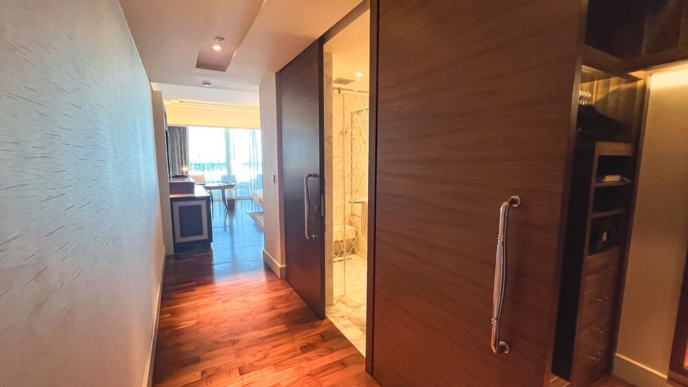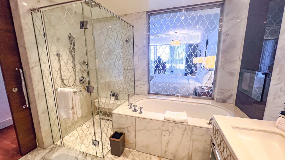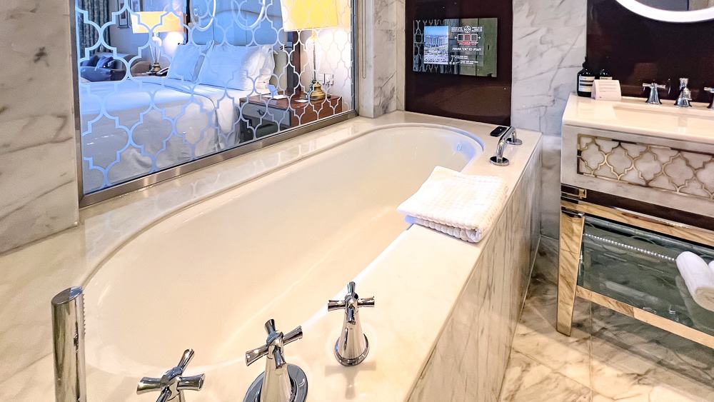 La chambre dispose à l’entrée d’un dressing de taille correcte pour deux personnes et d’une salle de bain en marbre incluant baignoire et douche avec vue sur la chambre et l’extérieur. On peut même regarder la télévision en prenant son bain.