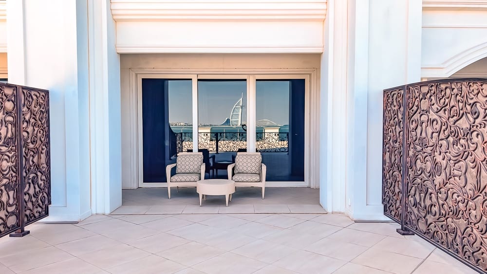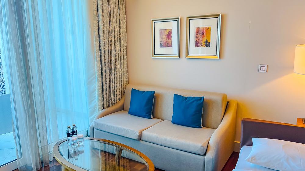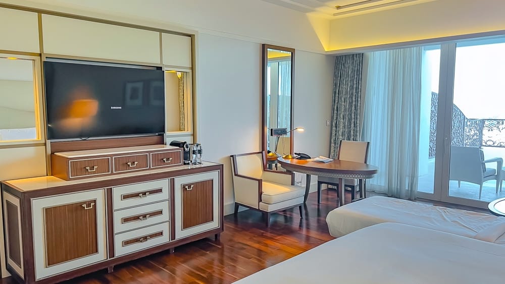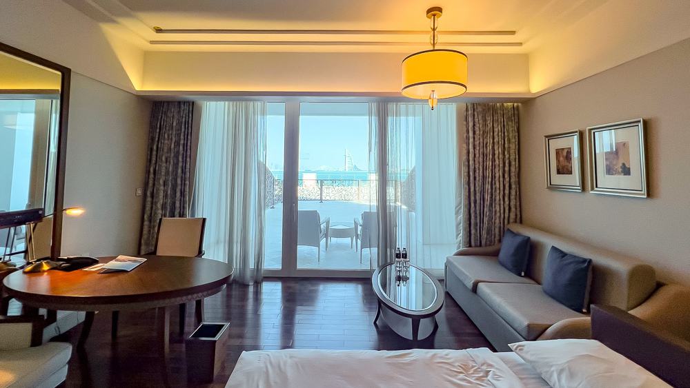 Dès notre entrée dans la chambre, nous sommes subjugués par la vue sur la mer et surtout le Burj Khalifa et al-Arab et avons une belle terrasse pour en profiter. L’ensemble est harmonieux dans des teintes douces de beige. La chambre inclus un bureau de travail, un canapé avec table basse.