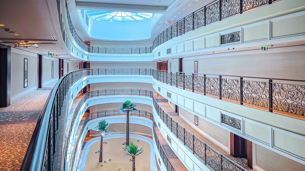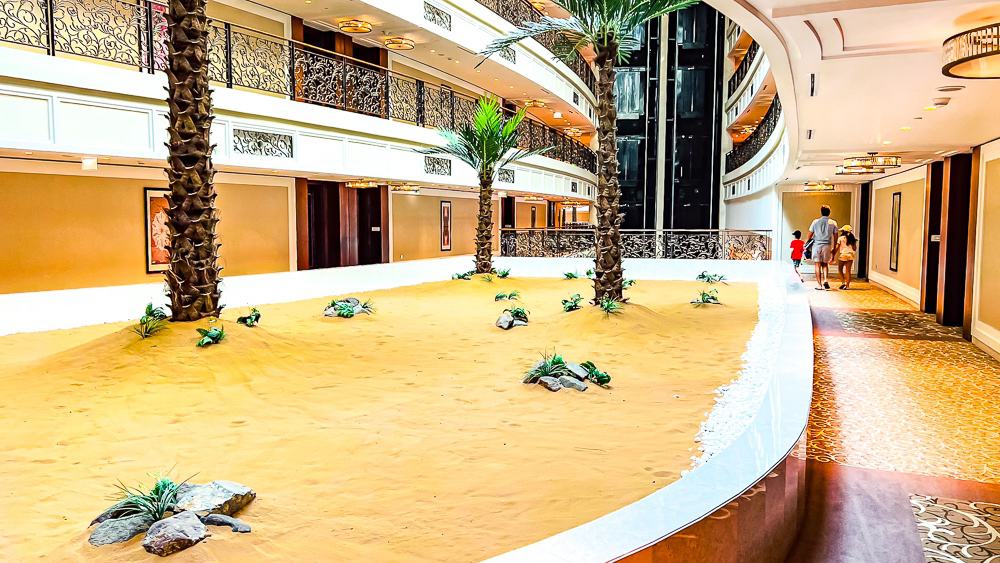 Les couloirs qui mènent aux chambres sont sobres et chics, tout en longueur. Aucune décoration superflue, seulement un espace aménagé de sable et palmiers sur lequel donne tous les étages avec un ascenseur transparent.