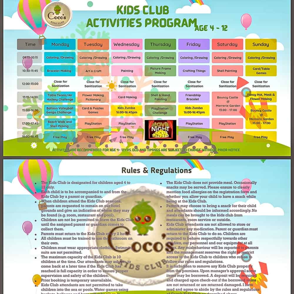 Un des plus gros avantages de cet hôtel pour les familles est sans doute son Kids Club. Les enfants de 4 à 12 ans sont accueillis au centre de 9 h à 17 h pour des activités qui changent tous les jours. Un parc pour enfant fermé protégé du soleil et des jeux extérieurs pour toute la famille sont disponibles : table de ping pong, fléchettes, etc.